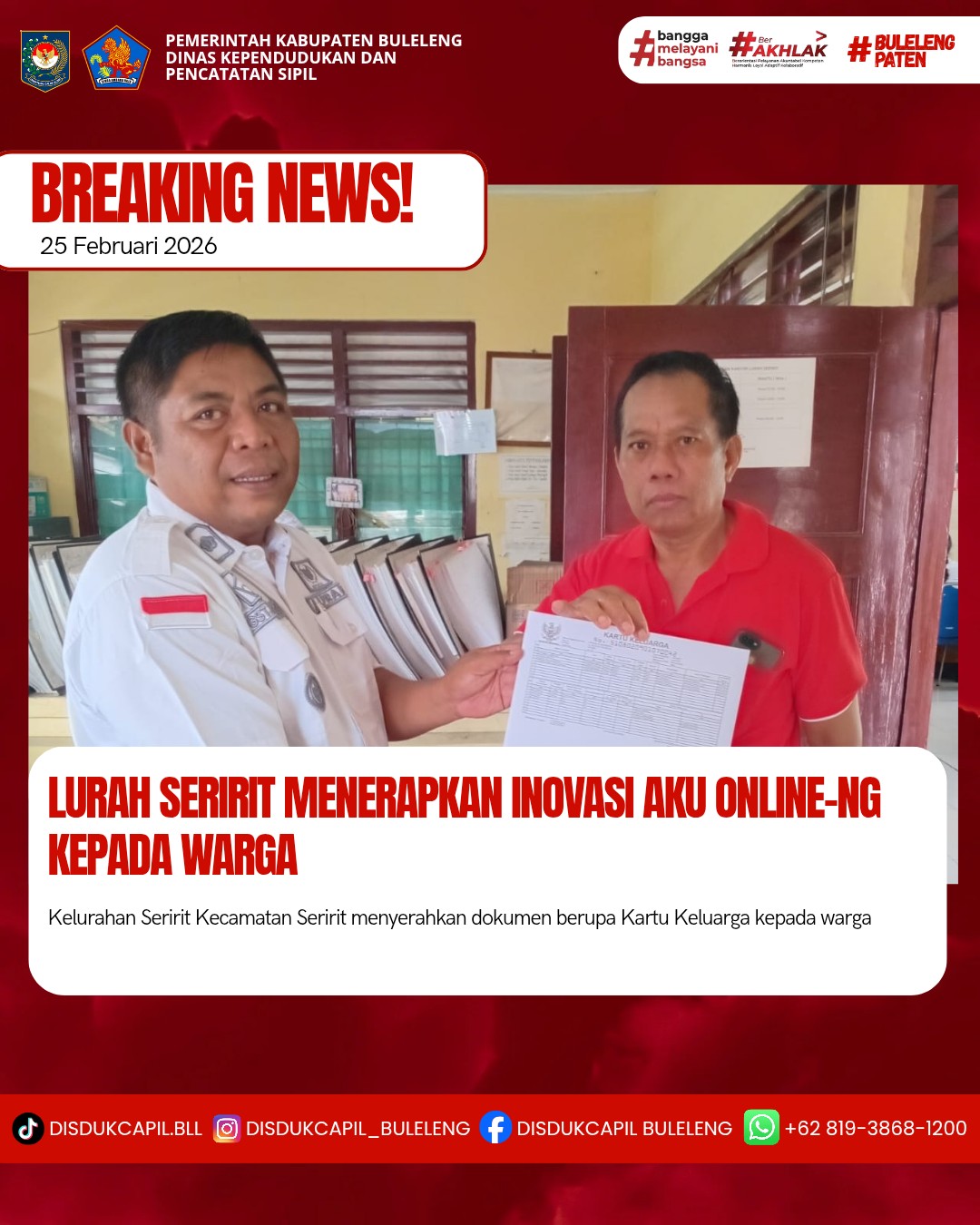 Pemerintah Kabupaten Buleleng melalui Dinas Kependudukan dan Pecatatan Sipil (Disdukcapil) Kabupaten Buleleng memaksimalkan serta mempermudah pelayanan kependudukan masyarakat dengan beberapa inovasi, melalui aplikasi AKU Online-NG. Dimana dalam penerapan aplikasi Aku Online-NG tersebut masyarakat tidak perlu lagi datang ke Dinas Dukcapil untuk melakukan pelayanan langsung cukup dengan datang ke Desa nanti akan dibantu oleh operator Desa masing-masing. Di Kelurahan Seririt Kecamatan Seririt, telah diserahkan dokumen kependudukan berupa Kartu Keluarga karena hilang atas nama I Nyoman Darmawan yang diserahkan langsung oleh Lurah Kelurahan Seririt I Gusti Putu Sugiro, S.Sos,M.AP di Kecamatan Seririt, Kabupaten Buleleng, Rabu (25/2).