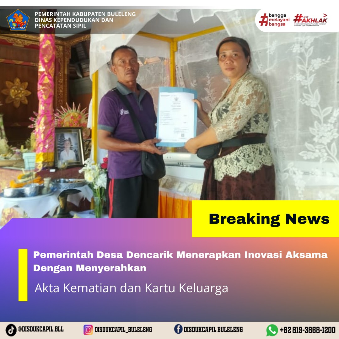 Pemerintah Kabupaten Buleleng melalui Dinas Kependudukan dan Pecatatan Sipil (Disdukcapil) Kabupaten Buleleng memaksimalkan serta mempermudah pelayanan kependudukan masyarakat dengan beberapa inovasi, yakni BALITA (Bayi Lahir Berakta), NYAKSI (Menyerahkan Akta Kawin Saat Acara Perkawinan) dan AKSAMA ( Akta Kematian Diserahkan Saat Masih Berduka) melalui aplikasi Aku Online-NG. Di Desa Dencarik Kecamatan Banjar, telah diterapkan program Aksama (Akta Kematian Diserahkan Saat Masih Berduka) yang dilakukan secara langsung oleh Kelian Banjar Dinas Baingin, Desa Dencarik dengan menyerahkan Akta Kematian dan Kartu Keluarga kepada keluarga almarhum di Desa Dencarik, Kamis (27/11).