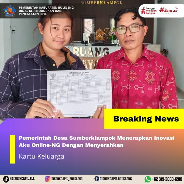 Pemerintah Kabupaten Buleleng melalui Dinas Kependudukan dan Pecatatan Sipil (Disdukcapil) Kabupaten Buleleng memaksimalkan serta mempermudah pelayanan kependudukan masyarakat dengan beberapa inovasi, melalui aplikasi AKU Online-NG. Dimana dalam penerapan aplikasi Aku Online-NG tersebut masyarakat tidak perlu lagi datang ke Dinas Dukcapil untuk melakukan pelayanan langsung cukup dengan datang ke Desa nanti akan dibantu oleh operator Desa masing-masing. Di Desa Sumberklampok Kecamatan Gerokgak, telah diserahkan dokumen kependudukan berupa Kartu Keluarga atas nama Gede Sudiartana yang diserahkan secara langsung oleh Pemerintah Desa Sumberklampok Kecamatan Gerokgak Kabupaten Buleleng, Selasa (25/11).