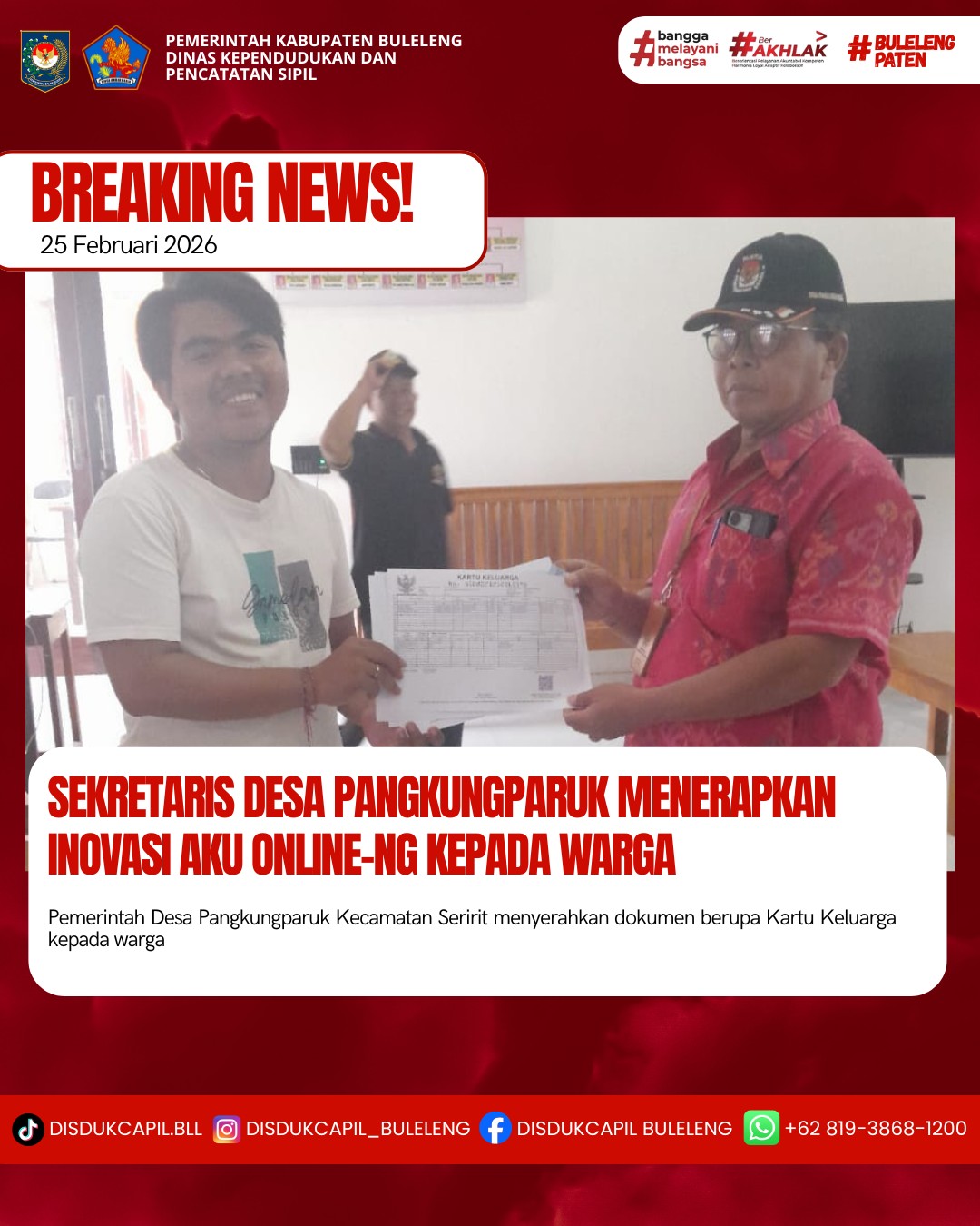 Pemerintah Kabupaten Buleleng melalui Dinas Kependudukan dan Pecatatan Sipil (Disdukcapil) Kabupaten Buleleng memaksimalkan serta mempermudah pelayanan kependudukan masyarakat dengan beberapa inovasi, melalui aplikasi AKU Online-NG. Dimana dalam penerapan aplikasi Aku Online-NG tersebut masyarakat tidak perlu lagi datang ke Dinas Dukcapil untuk melakukan pelayanan langsung cukup dengan datang ke Desa nanti akan dibantu oleh operator Desa masing-masing. Di Desa Pangkungparuk Kecamatan Seririt, telah diserahkan dokumen kependudukan berupa Kartu Keluarga atas nama Gede Aditiana warga Banjar Dinas Pangkungparuk Desa Pangkungparuk yang diserahkan oleh Pemerintah Desa Pangkungparuk, Rabu (25/2).