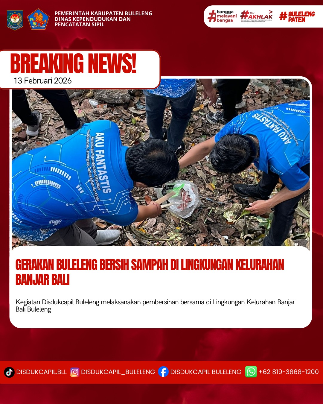 Gerakan Buleleng Bersih Sampah merupakan inisiatif Pemerintah Kabupaten Buleleng untuk mengelola sampah berbasis sumber melalui aksi gotong royong rutin setiap hari Jumat. Dalam aksi gotong royong hari ini jumat 13 Februari 2026 dilaksanakan kegiatan pemungutan sampah non organik (plastic) dan juga sampah organik di wilayah kelurahan Banjar Bali tepatnya di Lingkungan Tegal mawar dan Bantaran Tukad Buleleng hilir (di belakang RRI/Buitan) dan juga dilakukan pembersihan dan pemangkasan dahan/ranting pohon perindang di sekitar areal Kantor Disdukcapil kabupaten buleleng untuk menjaga keasrian dan keindahan Lingkungan Kantor. Gerakan Buleleng Bersih Sampah ini merupakan Langkah nyata dari Pemerintah Kabupaten Buleleng yang berkolaborasi dengan lintas instansi hingga Masyarakat untuk menjaga kebersihan dan kelestarian Lingkungan, dengan tujuan membangun kesadaran Masyarakat dalam memilah sampah dari sumbernya.