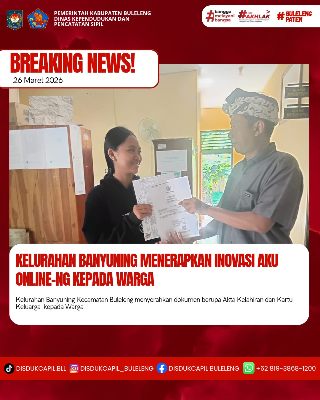 Pemerintah Kabupaten Buleleng melalui Dinas Kependudukan dan Pecatatan Sipil (Disdukcapil) Kabupaten Buleleng memaksimalkan serta mempermudah pelayanan kependudukan masyarakat dengan beberapa inovasi, melalui aplikasi AKU Online-NG. Dimana dalam penerapan aplikasi Aku Online-NG tersebut masyarakat tidak perlu lagi datang ke Dinas Dukcapil untuk melakukan pelayanan langsung, cukup dengan datang ke Desa nanti akan dibantu oleh operator Desa masing-masing. Di Kelurahan Banyuning Kecamatan Buleleng, telah diserahkan dokumen kependudukan berupa Tridatu Akta Kelahiran warga Kelurahan Banyuning yang diserahkan langsung oleh Operator Kelurahan Banyuning Kecamatan Buleleng, Kabupaten Buleleng, Kamis (26/3).
