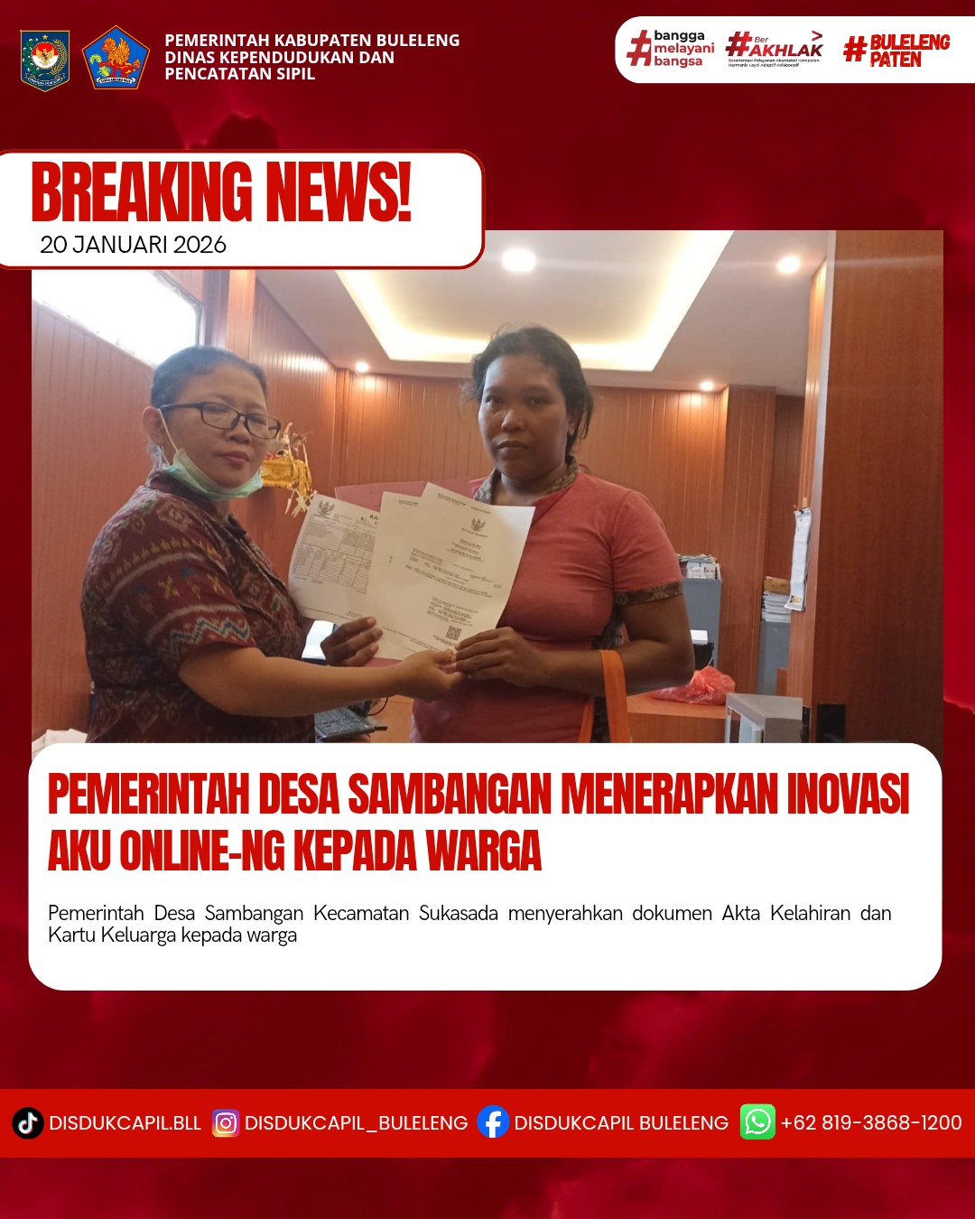 Pemerintah Kabupaten Buleleng melalui Dinas Kependudukan dan Pecatatan Sipil (Disdukcapil) Kabupaten Buleleng memaksimalkan serta mempermudah pelayanan kependudukan masyarakat dengan beberapa inovasi, melalui aplikasi AKU Online-NG. Dimana dalam penerapan aplikasi Aku Online-NG tersebut masyarakat tidak perlu lagi datang ke Dinas Dukcapil untuk melakukan pelayanan langsung cukup dengan datang ke Desa nanti akan dibantu oleh operator Desa masing-masing. Di Desa Sambangan Kecamatan Sukasada, telah diserahkan dokumen kependudukan berupa Akta Kelahiran atas nama Komang Trisna Dewi dan Ketut Arta Putra dan Kartu Keluarga atas nama Komang Budi Arta diserahkan oleh Kasi Pemerintahan Desa Sambangan bertempat di Kantor Perbekel Desa Sambangan, Kecamatan Sukasada, Kabupaten Buleleng, Selasa (20/1).