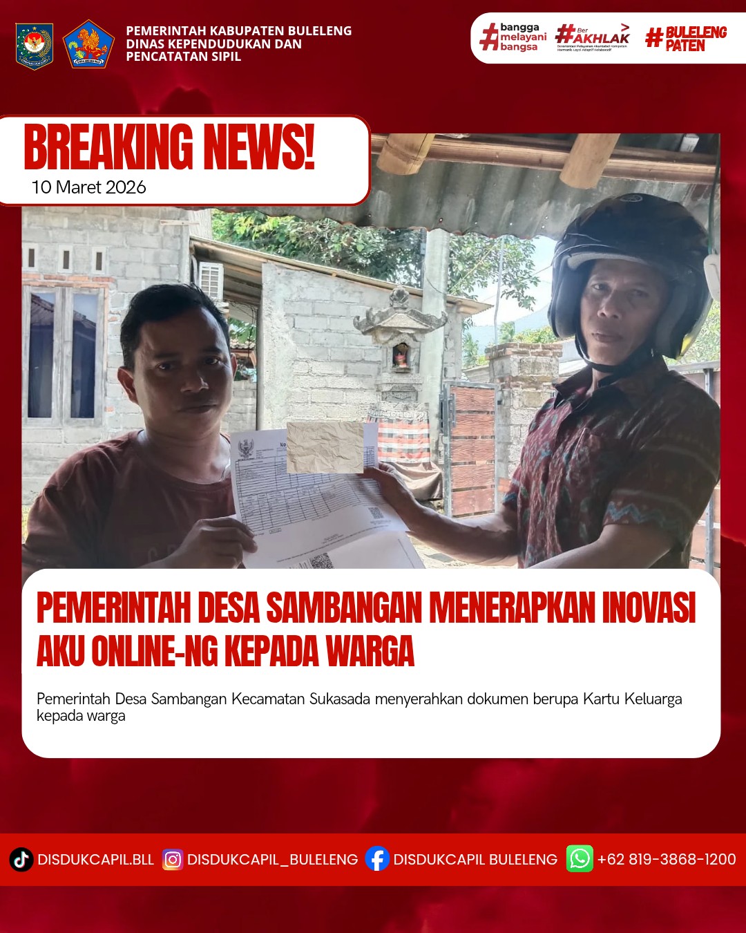 Pemerintah Kabupaten Buleleng melalui Dinas Kependudukan dan Pecatatan Sipil (Disdukcapil) Kabupaten Buleleng memaksimalkan serta mempermudah pelayanan kependudukan masyarakat dengan beberapa inovasi, melalui aplikasi AKU Online-NG. Dimana dalam penerapan aplikasi Aku Online-NG tersebut masyarakat tidak perlu lagi datang ke Dinas Dukcapil untuk melakukan pelayanan langsung cukup dengan datang ke Desa nanti akan dibantu oleh operator Desa masing-masing. Di Desa Sambangan Kecamatan Sukasada, telah diserahkan dokumen kependudukan berupa dua buah dokumen Kartu Keluarga yang diserahkan oleh Kadus Desa Sambangan bertempat di Kantor Perbekel Desa Sambangan, Kecamatan Sukasada, Kabupaten Buleleng, Selasa (10/3).