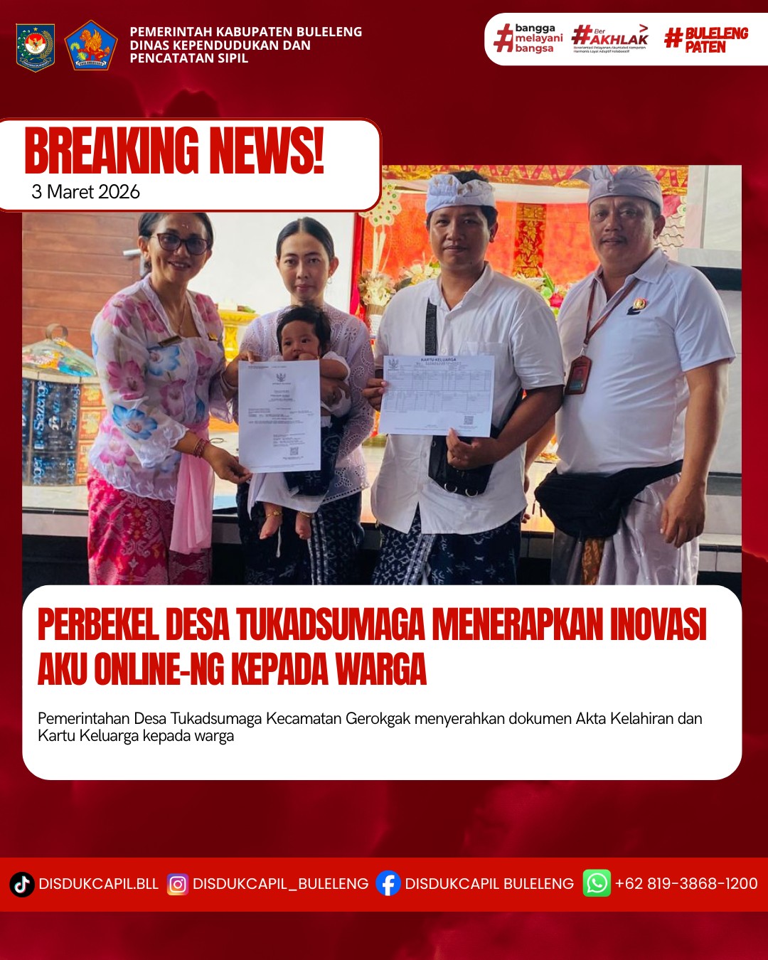 Pemerintah Kabupaten Buleleng melalui Dinas Kependudukan dan Pecatatan Sipil (Disdukcapil) Kabupaten Buleleng memaksimalkan serta mempermudah pelayanan kependudukan masyarakat dengan beberapa inovasi, melalui aplikasi AKU Online-NG. Dimana dalam penerapan aplikasi Aku Online-NG tersebut masyarakat tidak perlu lagi datang ke Dinas Dukcapil untuk melakukan pelayanan langsung cukup dengan datang ke Desa nanti akan dibantu oleh operator Desa masing-masing. Di Desa Tukadsumaga Kecamatan Gerokgak, telah diserahkan dokumen kependudukan berupa Akta Kelahiran atas nama I putu Andy Pradana Yodha dan Kartu Keluarga atas nama I Gede Ariawan yang diserahkan oleh Perbekel Desa Tukadsumaga Anak Agung Sri Wathi didampingi oleh Kelian Banjar Dinas Buluh Ketut Artaya di Desa Tukadsumaga, Selasa (3/3).