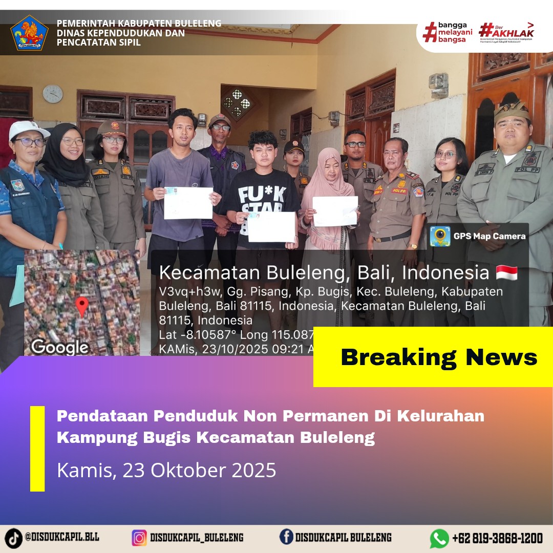 Kali ini Kamis, 23 Oktober 2025, Dinas Kependudukan dan Pencatatan Sipil Kabupaten Buleleng melaksanakan kegiatan pendataan penduduk Non Permanen di Kelurahan Kampung Bugis Kecamatan Buleleng. Dari pendataan penduduk kali ini didapatkan hasil :