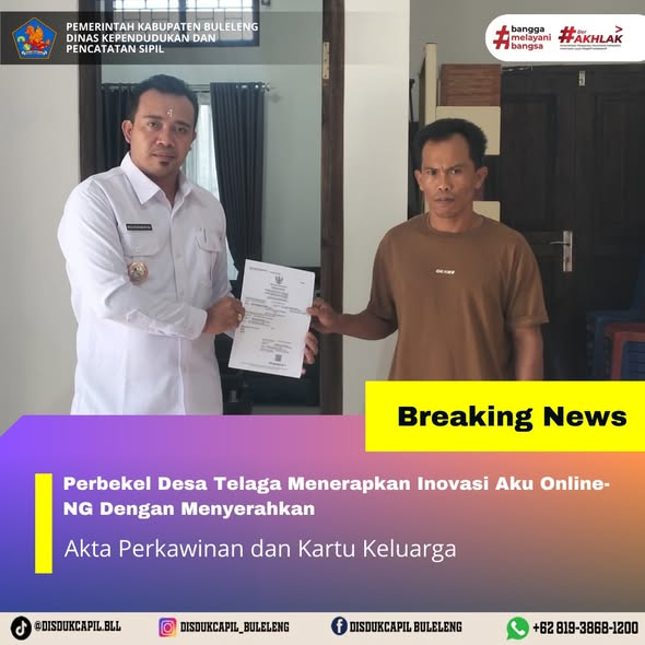 Pemerintah Kabupaten Buleleng melalui Dinas Kependudukan dan Pecatatan Sipil (Disdukcapil) Kabupaten Buleleng memaksimalkan serta mempermudah pelayanan kependudukan masyarakat dengan beberapa inovasi, melalui aplikasi AKU Online-NG. Dimana dalam penerapan aplikasi Aku Online-NG tersebut masyarakat tidak perlu lagi datang ke Dinas Dukcapil untuk melakukan pelayanan langsung cukup dengan datang ke Desa nanti akan dibantu oleh operator Desa masing-masing. Di Desa Telaga Kecamatan Busungbiu, telah diserahkan dokumen kependudukan berupa Akta Perkawinan dan Kartu Keluarga yang diserahkan langsung oleh Perbekel Desa Telaga MADE HENDRA MAHAYUDA,S.PD bertempat di Kantor Perbekel Desa Telaga, Kecamatan Busungbi, Kabupaten Buleleng, Rabu (17/12).