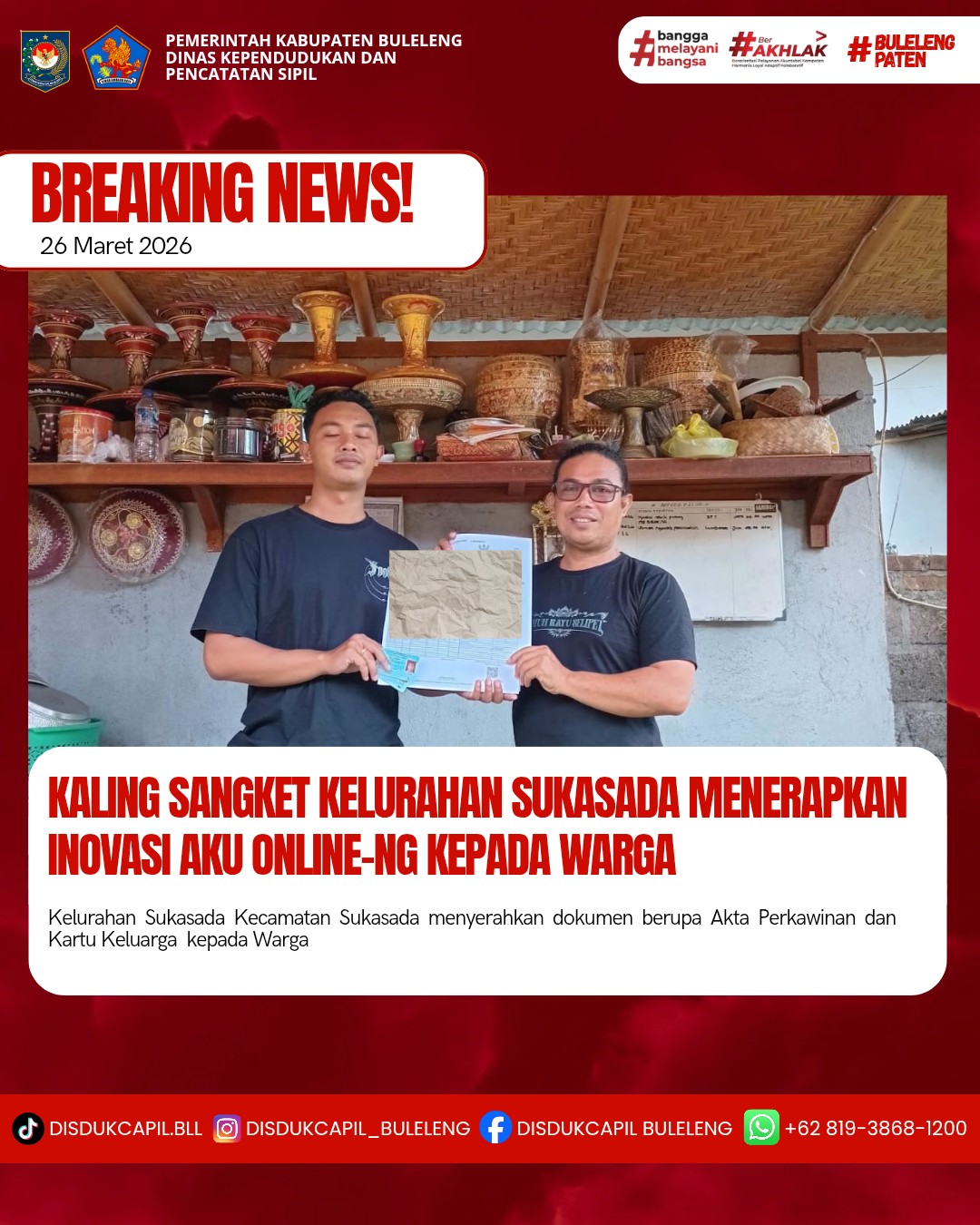 Pemerintah Kabupaten Buleleng melalui Dinas Kependudukan dan Pecatatan Sipil (Disdukcapil) Kabupaten Buleleng memaksimalkan serta mempermudah pelayanan kependudukan masyarakat dengan beberapa inovasi, melalui aplikasi AKU Online-NG. Dimana dalam penerapan aplikasi Aku Online-NG tersebut masyarakat tidak perlu lagi datang ke Dinas Dukcapil untuk melakukan pelayanan langsung, cukup dengan datang ke Desa nanti akan dibantu oleh operator Desa masing-masing. Di Kelurahan Sukasada Kecamatan Sukasada, telah diserahkan dokumen kependudukan berupa Akta Perkawinan dan Kartu Keluarga atas nama Putu Eri Budariawan warga Lingkungan Sangket, Kelurahan Sukasada yang diserahkan langsung oleh Kepala Lingkungan Sangket Kelurahan Sukasada Kecamatan Sukasada, Kabupaten Buleleng, Kamis (26/3).