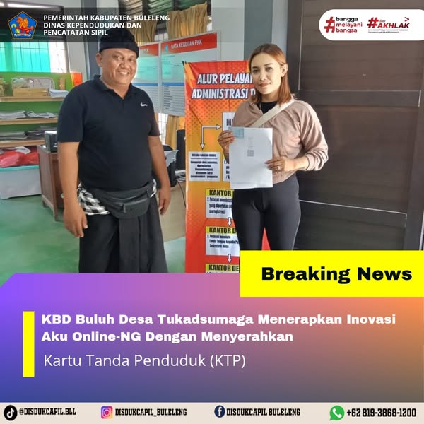 Pemerintah Kabupaten Buleleng melalui Dinas Kependudukan dan Pecatatan Sipil (Disdukcapil) Kabupaten Buleleng memaksimalkan serta mempermudah pelayanan kependudukan masyarakat dengan beberapa inovasi, melalui aplikasi AKU Online-NG. Dimana dalam penerapan aplikasi Aku Online-NG tersebut masyarakat tidak perlu lagi datang ke Dinas Dukcapil untuk melakukan pelayanan langsung cukup dengan datang ke Desa nanti akan dibantu oleh operator Desa masing-masing. Di Desa Tukadsumaga Kecamatan Gerokgak, telah diserahkan dokumen kependudukan berupa KTP atas nama Ni Luh Sumerlini yang diserahkan oleh Kelian Banjar Dinas Buluh Desa Tukadsumaga di Kantor Perbekel Desa Tukadsumaga, Senin (4/8).