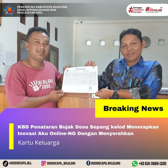 Pemerintah Kabupaten Buleleng melalui Dinas Kependudukan dan Pecatatan Sipil (Disdukcapil) Kabupaten Buleleng memaksimalkan serta mempermudah pelayanan kependudukan masyarakat dengan beberapa inovasi, melalui aplikasi AKU Online. Dimana dalam penerapan aplikasi Aku Online tersebut masyarakat tidak perlu lagi datang ke Dinas Dukcapil untuk melakukan pelayanan langsung cukup dengan datang ke Desa nanti akan dibantu oleh operator Desa masing-masing. Di Desa Sepang Kelod Kecamatan Busungbiu telah diserahkan dokumen kependudukan berupa Kartu Keluarga yang diserahkan oleh Kelian Banjar Dinas Penataran Bujak Desa Sepang Kelod Kecamatan Busungbiu, Selasa (9/12).