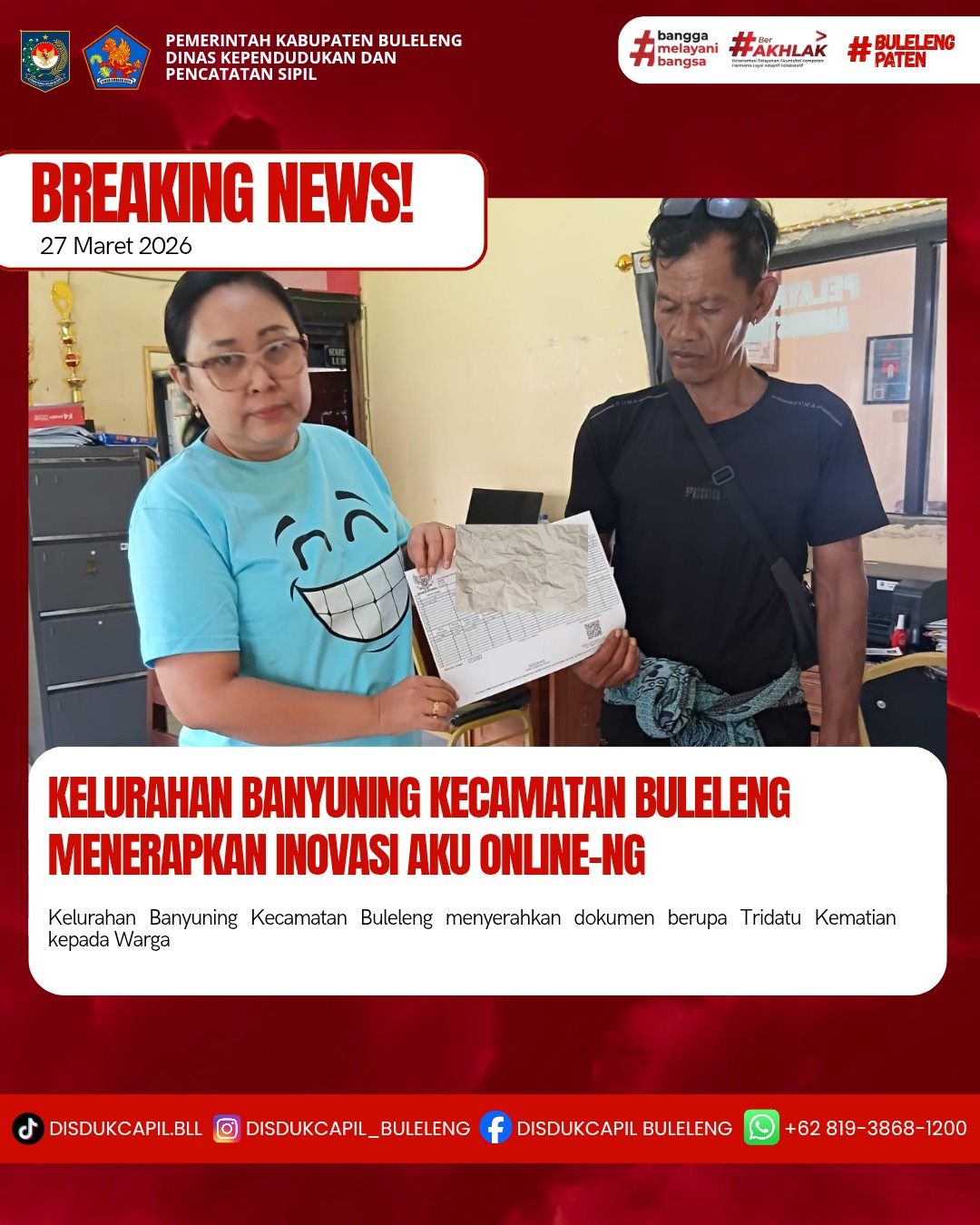 Pemerintah Kabupaten Buleleng melalui Dinas Kependudukan dan Pecatatan Sipil (Disdukcapil) Kabupaten Buleleng memaksimalkan serta mempermudah pelayanan kependudukan masyarakat dengan beberapa inovasi, melalui aplikasi AKU Online-NG. Dimana dalam penerapan aplikasi Aku Online-NG tersebut masyarakat tidak perlu lagi datang ke Dinas Dukcapil untuk melakukan pelayanan langsung, cukup dengan datang ke Desa nanti akan dibantu oleh operator Desa masing-masing. Di Kelurahan Banyuning Kecamatan Buleleng, telah diserahkan dokumen kependudukan berupa Tridatu Akta Kematian warga Kelurahan Banyuning yang diserahkan langsung oleh Staf Kelurahan Banyuning Kecamatan Buleleng, Kabupaten Buleleng, Jumat (27/3).