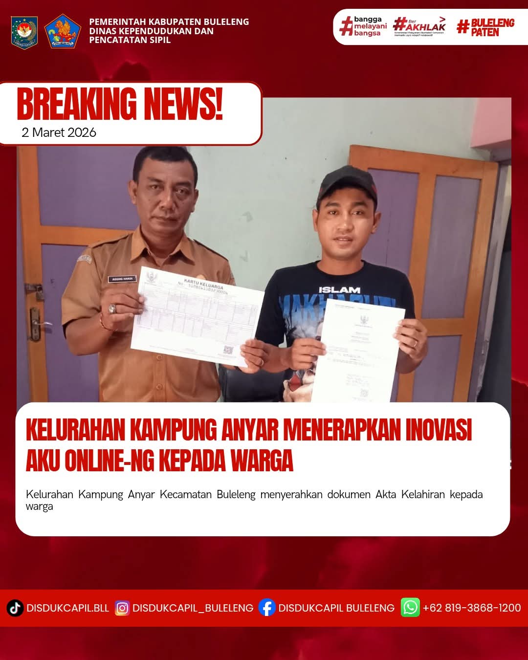 Pemerintah Kabupaten Buleleng melalui Dinas Kependudukan dan Pecatatan Sipil (Disdukcapil) Kabupaten Buleleng memaksimalkan serta mempermudah pelayanan kependudukan masyarakat dengan beberapa inovasi, melalui aplikasi AKU Online-NG. Dimana dalam penerapan aplikasi Aku Online-NG tersebut masyarakat tidak perlu lagi datang ke Dinas Dukcapil untuk melakukan pelayanan langsung cukup dengan datang ke Desa nanti akan dibantu oleh operator Desa masing-masing. Di Kelurahan Kampung Anyar Kecamatan Buleleng, telah diserahkan dokumen kependudukan berupa Akta Kelahiran atas nama Haris Farisal yang diserahkan langsung oleh Kelurahan Kampung Anyar Kecamatan Buleleng, Kabupaten Buleleng, Senin (2/3).