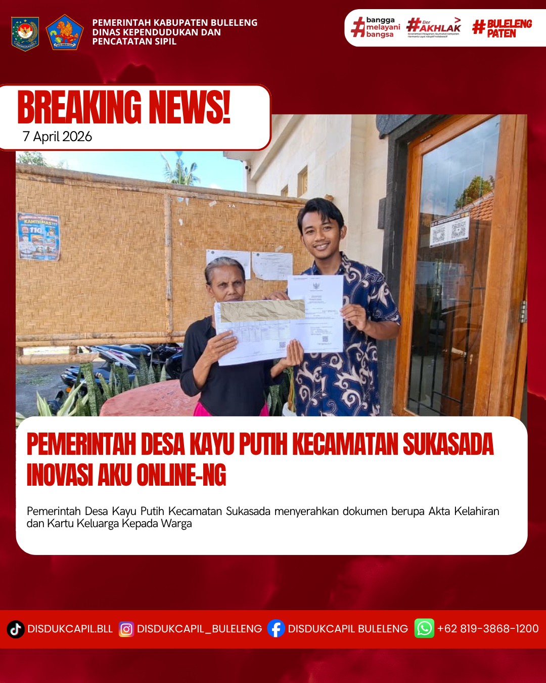 Pemerintah Kabupaten Buleleng melalui Dinas Kependudukan dan Pecatatan Sipil (Disdukcapil) Kabupaten Buleleng memaksimalkan serta mempermudah pelayanan kependudukan masyarakat dengan beberapa inovasi, melalui aplikasi AKU Online-NG. Dimana dalam penerapan aplikasi Aku Online-NG tersebut masyarakat tidak perlu lagi datang ke Dinas Dukcapil untuk melakukan pelayanan langsung cukup dengan datang ke Desa nanti akan dibantu oleh operator Desa masing-masing. Di Desa Kayu Putih Kecamatan Sukasada, telah diserahkan dokumen kependudukan berupa Akta Kelahiran atas nama Ketut Manis dan Kartu Keluarga atas nama Nengah Badra warga Banjar Dinas Kayuputih, Desa Kayu Putih, Kecamatan Sukasada yang diserahkan secara langsung oleh Kasi Pelayanan Desa Kayu Putih Kecamatan Sukasada, Selasa (7/4).