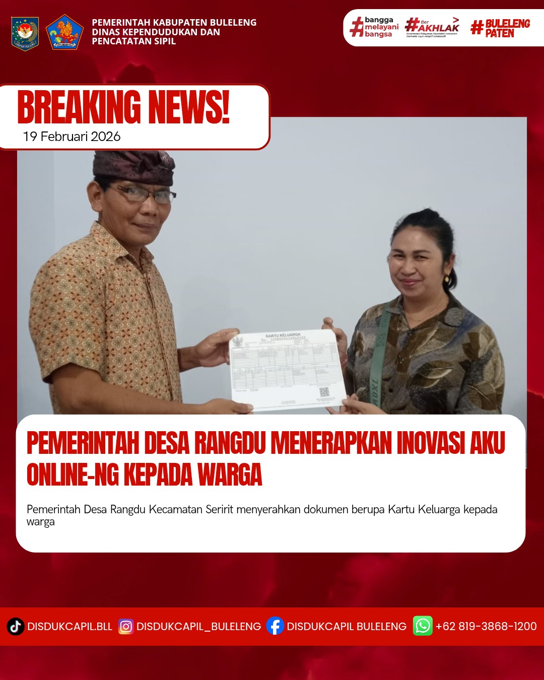 Pemerintah Kabupaten Buleleng melalui Dinas Kependudukan dan Pecatatan Sipil (Disdukcapil) Kabupaten Buleleng memaksimalkan serta mempermudah pelayanan kependudukan masyarakat dengan beberapa inovasi, melalui aplikasi AKU Online. Dimana dalam penerapan aplikasi Aku Online tersebut masyarakat tidak perlu lagi datang ke Dinas Dukcapil untuk melakukan pelayanan langsung cukup dengan datang ke Desa nanti akan dibantu oleh operator Desa masing-masing. Di Desa Rangdu Kecamatan Seririt telah diserahkan dokumen kependudukan berupa Kartu Keluarga atas nama Putu Dodik Hartana diserahkan langsung oleh Kadus Karya Nadi I Made Suwastika di Desa Rangdu Kecamatan Seririt, Kamis (19/2).