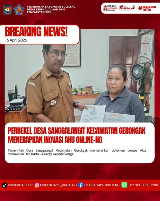 Pemerintah Kabupaten Buleleng melalui Dinas Kependudukan dan Pecatatan Sipil (Disdukcapil) Kabupaten Buleleng memaksimalkan serta mempermudah pelayanan kependudukan masyarakat dengan beberapa inovasi, melalui aplikasi AKU Online-NG. Dimana dalam penerapan aplikasi Aku Online-NG tersebut masyarakat tidak perlu lagi datang ke Dinas Dukcapil untuk melakukan pelayanan langsung, cukup dengan datang ke Desa nanti akan dibantu oleh operator Desa masing-masing. Di Desa Sanggalangit Kecamatan Gerokgak, telah diserahkan dokumen kependudukan berupa Akta Perkawinan dan Kartu Keluarga kepada warga atas nama Dewa Made Deni Sastrawan warga Banjar Dinas Tukadpule Desa Sanggalangit yang diserahkan langsung oleh Operator Aku Online, Desa Sanggalangit, Senin (6/4).