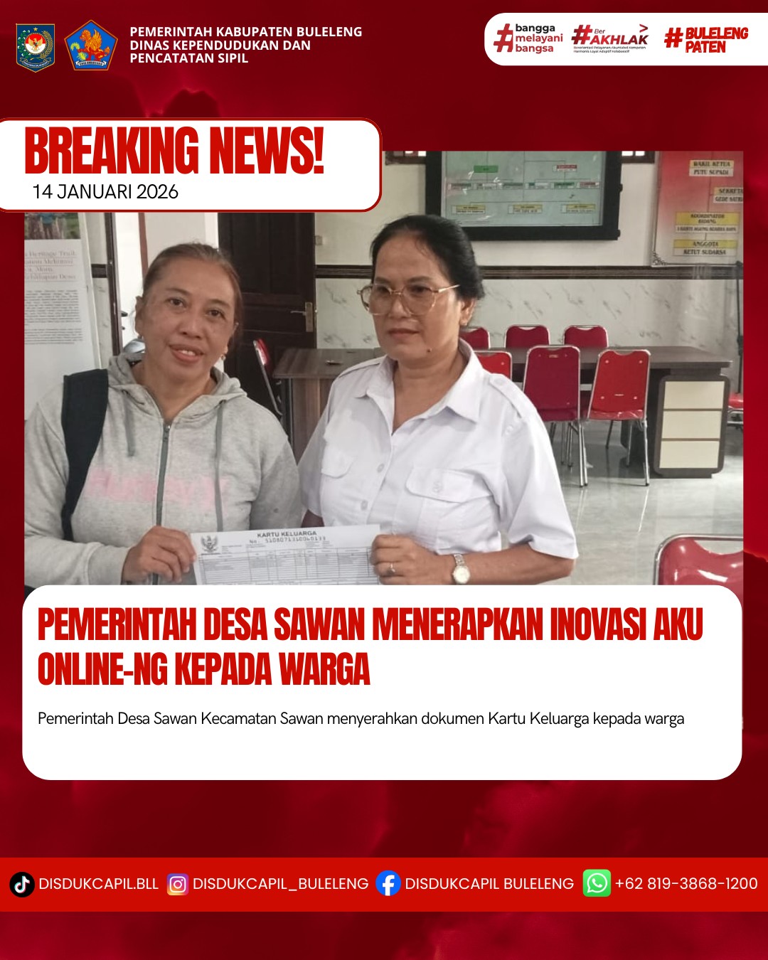 Pemerintah Kabupaten Buleleng melalui Dinas Kependudukan dan Pecatatan Sipil (Disdukcapil) Kabupaten Buleleng memaksimalkan serta mempermudah pelayanan kependudukan masyarakat dengan beberapa inovasi, melalui aplikasi AKU Online-NG. Dimana dalam penerapan aplikasi Aku Online-NG tersebut masyarakat tidak perlu lagi datang ke Dinas Dukcapil untuk melakukan pelayanan langsung cukup dengan datang ke Desa nanti akan dibantu oleh operator Desa masing-masing. Di Desa Sawan Kecamatan Sawan, Pemerintahan Desa Sawan telah menyerahkan dokumen kependudukan berupa Kartu Keluarga atas nama Putu Supadi yang diserahkan oleh Kaur tata usaha dan umum Desa Sawan, Rabu (14/1).