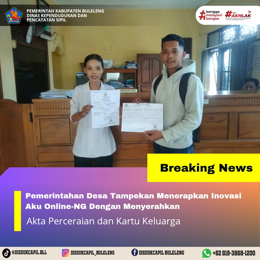 Pemerintah Kabupaten Buleleng melalui Dinas Kependudukan dan Pecatatan Sipil (Disdukcapil) Kabupaten Buleleng memaksimalkan serta mempermudah pelayanan kependudukan masyarakat dengan beberapa inovasi, melalui aplikasi AKU Online-NG. Dimana dalam penerapan aplikasi Aku Online-NG tersebut masyarakat tidak perlu lagi datang ke Dinas Dukcapil untuk melakukan pelayanan langsung cukup dengan datang ke Desa nanti akan dibantu oleh operator Desa masing-masing. Di Desa Tampekan Kecamatan Banjar, telah diserahkan dokumen kependudukan berupa Akta Perceraian dan Kartu Keluarga atas nama Kadek Hendra Riski Darmawan warga Desa Tampekan yang diserahkan langsung oleh Pemerintahan Desa Tampekan, Rabu (24/9).