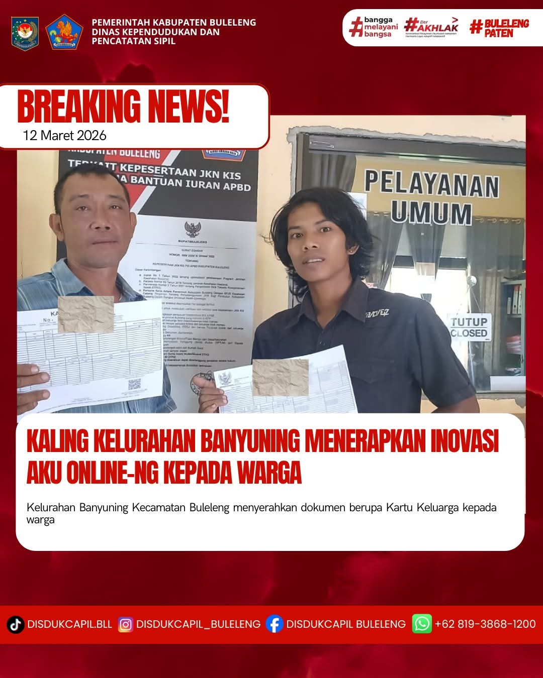 Pemerintah Kabupaten Buleleng melalui Dinas Kependudukan dan Pecatatan Sipil (Disdukcapil) Kabupaten Buleleng memaksimalkan serta mempermudah pelayanan kependudukan masyarakat dengan beberapa inovasi, melalui aplikasi AKU Online-NG. Dimana dalam penerapan aplikasi Aku Online-NG tersebut masyarakat tidak perlu lagi datang ke Dinas Dukcapil untuk melakukan pelayanan langsung cukup dengan datang ke Desa nanti akan dibantu oleh operator Desa masing-masing. Di Kelurahan Banyuasri Kecamatan Buleleng, telah diserahkan dokumen kependudukan berupa Kartu Keluarga yang diserahkan langsung oleh Kaling Kelurahan Banyuasri, Kecamatan Buleleng, Kabupaten Buleleng, Kamis (12/3).