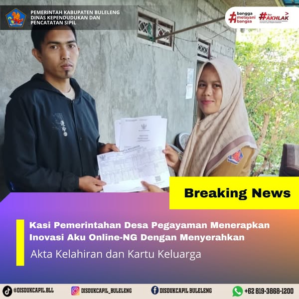 Pemerintah Kabupaten Buleleng melalui Dinas Kependudukan dan Pecatatan Sipil (Disdukcapil) Kabupaten Buleleng memaksimalkan serta mempermudah pelayanan kependudukan masyarakat dengan beberapa inovasi, melalui aplikasi AKU Online-NG. Dimana dalam penerapan aplikasi Aku Online-NG tersebut masyarakat tidak perlu lagi datang ke Dinas Dukcapil untuk melakukan pelayanan langsung cukup dengan datang ke Desa nanti akan dibantu oleh operator Desa masing-masing. Di Desa Pegayaman Kecamatan Sukasada, telah diserahkan dokumen kependudukan berupa Akta Kelahiran Kartu Keluarga kepada warga atas nama NI'AM MILLAH yang beralamat di Banjar Dinas Kubu lebah Desa Pegayaman yang diserahkan langsung oleh Kasi Pemerintahan Desa Pegayaman, Senin (15/9).