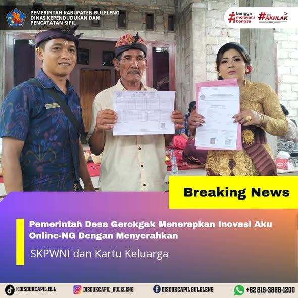 Pemerintah Kabupaten Buleleng melalui Dinas Kependudukan dan Pecatatan Sipil (Disdukcapil) Kabupaten Buleleng memaksimalkan serta mempermudah pelayanan kependudukan masyarakat dengan beberapa inovasi, melalui aplikasi AKU Online. Dimana dalam penerapan aplikasi Aku Online tersebut masyarakat tidak perlu lagi datang ke Dinas Dukcapil untuk melakukan pelayanan langsung cukup dengan datang ke Desa nanti akan dibantu oleh operator Desa masing-masing. Di Desa Gerokgak Kecamatan Gerokgak telah diserahkan dokumen kependudukan berupa SKPWNI atas nama Ni Kadek Sariani, serta penyerahan Kartu Keluarga atas nama Wayan Seringgen yang diserahkan langsung oleh Kelian Banjar Dinas Pucaksari, Desa Gerokgak, Senin (3/11).