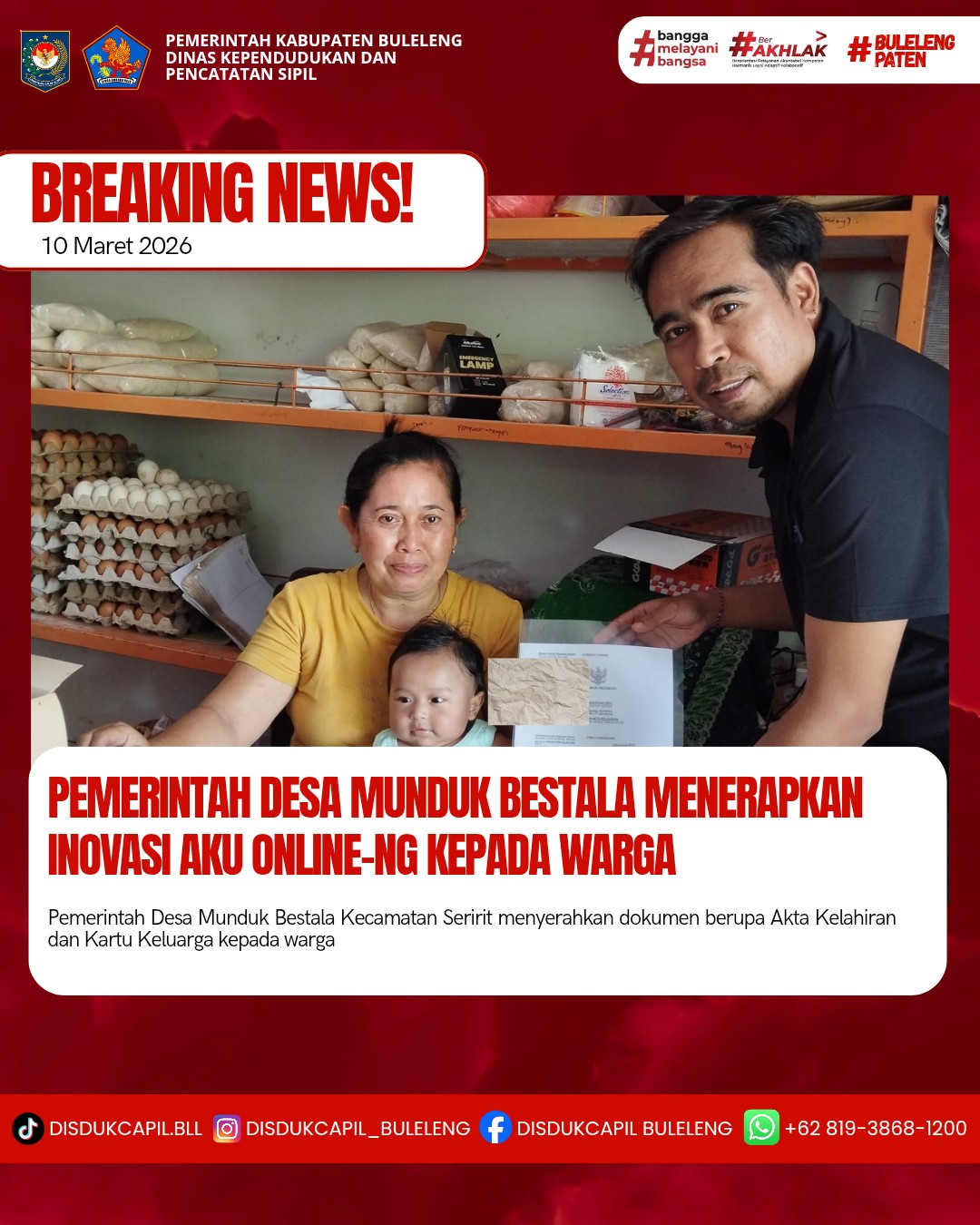 Pemerintah Kabupaten Buleleng melalui Dinas Kependudukan dan Pecatatan Sipil (Disdukcapil) Kabupaten Buleleng memaksimalkan serta mempermudah pelayanan kependudukan masyarakat dengan beberapa inovasi, melalui aplikasi AKU Online. Dimana dalam penerapan aplikasi Aku Online tersebut masyarakat tidak perlu lagi datang ke Dinas Dukcapil untuk melakukan pelayanan langsung cukup dengan datang ke Desa nanti akan dibantu oleh operator Desa masing-masing. Di Desa Munduk Bestala Kecamatan Seririt telah diserahkan dokumen kependudukan berupa Akta Kelahiran dan Kartu Keluarga atas nama Made Ade Indrawan oleh Kasi Kesejahteraan mewakili Perbekel Munduk Bestala Kecamatan Seririt, Selasa (10/3).