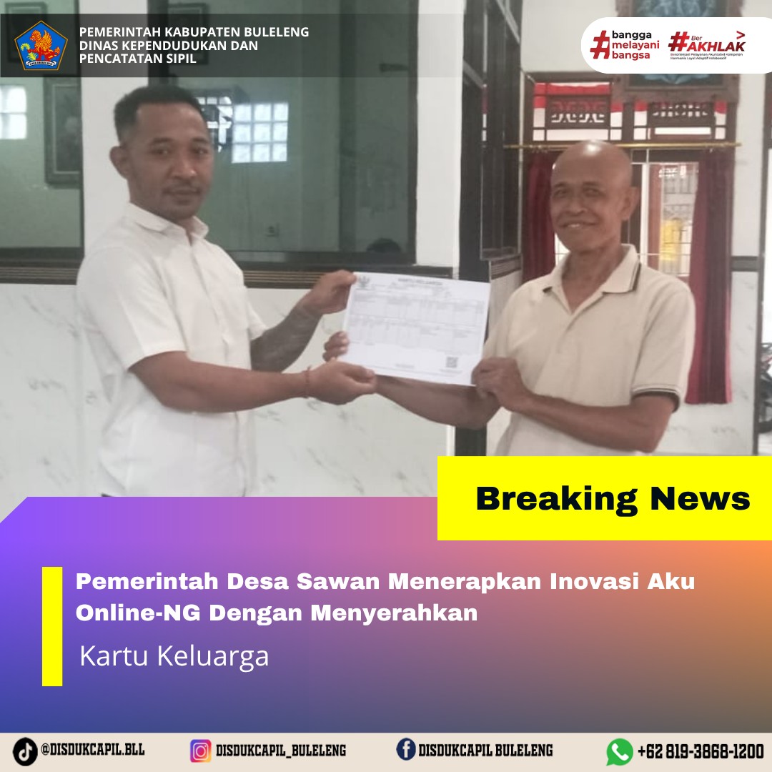 Pemerintah Kabupaten Buleleng melalui Dinas Kependudukan dan Pecatatan Sipil (Disdukcapil) Kabupaten Buleleng memaksimalkan serta mempermudah pelayanan kependudukan masyarakat dengan beberapa inovasi, melalui aplikasi AKU Online-NG. Dimana dalam penerapan aplikasi Aku Online-NG tersebut masyarakat tidak perlu lagi datang ke Dinas Dukcapil untuk melakukan pelayanan langsung cukup dengan datang ke Desa nanti akan dibantu oleh operator Desa masing-masing. Di Desa Sawan Kecamatan Sawan, telah diserahkan dokumen kependudukan berupa Kartu Keluarga atas nama Gede Pasek Mertadana yang diserahkan secara langsung oleh Staf Operator Desa Sawan, Rabu (15/10).