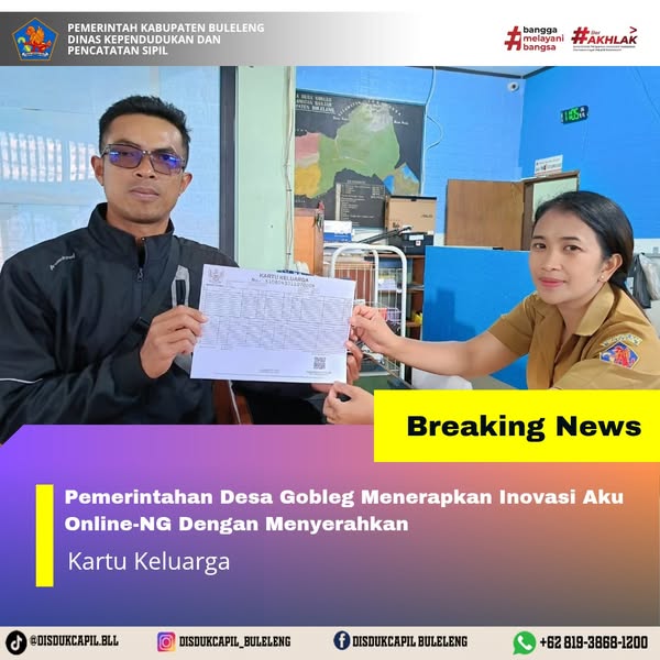 Pemerintah Kabupaten Buleleng melalui Dinas Kependudukan dan Pecatatan Sipil (Disdukcapil) Kabupaten Buleleng memaksimalkan serta mempermudah pelayanan kependudukan masyarakat dengan beberapa inovasi, melalui aplikasi AKU Online-NG. Dimana dalam penerapan aplikasi Aku Online-NG tersebut masyarakat tidak perlu lagi datang ke Dinas Dukcapil untuk melakukan pelayanan langsung cukup dengan datang ke Desa nanti akan dibantu oleh operator Desa masing-masing. Di Desa Gobleg Kecamatan Banjar, telah diserahkan dokumen kependudukan berupa Kartu Keluarga atas nama Wayan Dita aryawan yang diserahkan langsung oleh staf administrasi Desa Gobleg bertempat di Kantor Perbekel Desa Gobleg, Kecamatan Banjar, Kabupaten Buleleng, Senin (15/9).