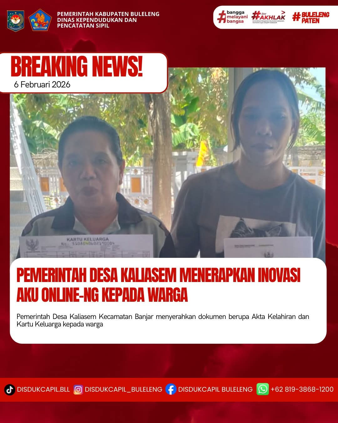 Pemerintah Kabupaten Buleleng melalui Dinas Kependudukan dan Pecatatan Sipil (Disdukcapil) Kabupaten Buleleng memaksimalkan serta mempermudah pelayanan kependudukan masyarakat dengan beberapa inovasi, melalui aplikasi AKU Online. Dimana dalam penerapan aplikasi Aku Online tersebut masyarakat tidak perlu lagi datang ke Dinas Dukcapil untuk melakukan pelayanan langsung cukup dengan datang ke Desa nanti akan dibantu oleh operator Desa masing-masing. Di Desa Kaliasem Kecamatan Banjar telah diserahkan dokumen kependudukan berupa Akta Kelahiran dan Kartu Keluarga yang diserahkan oleh Kasi Pemerintahan Desa Kaliasem, Jumat (6/2).