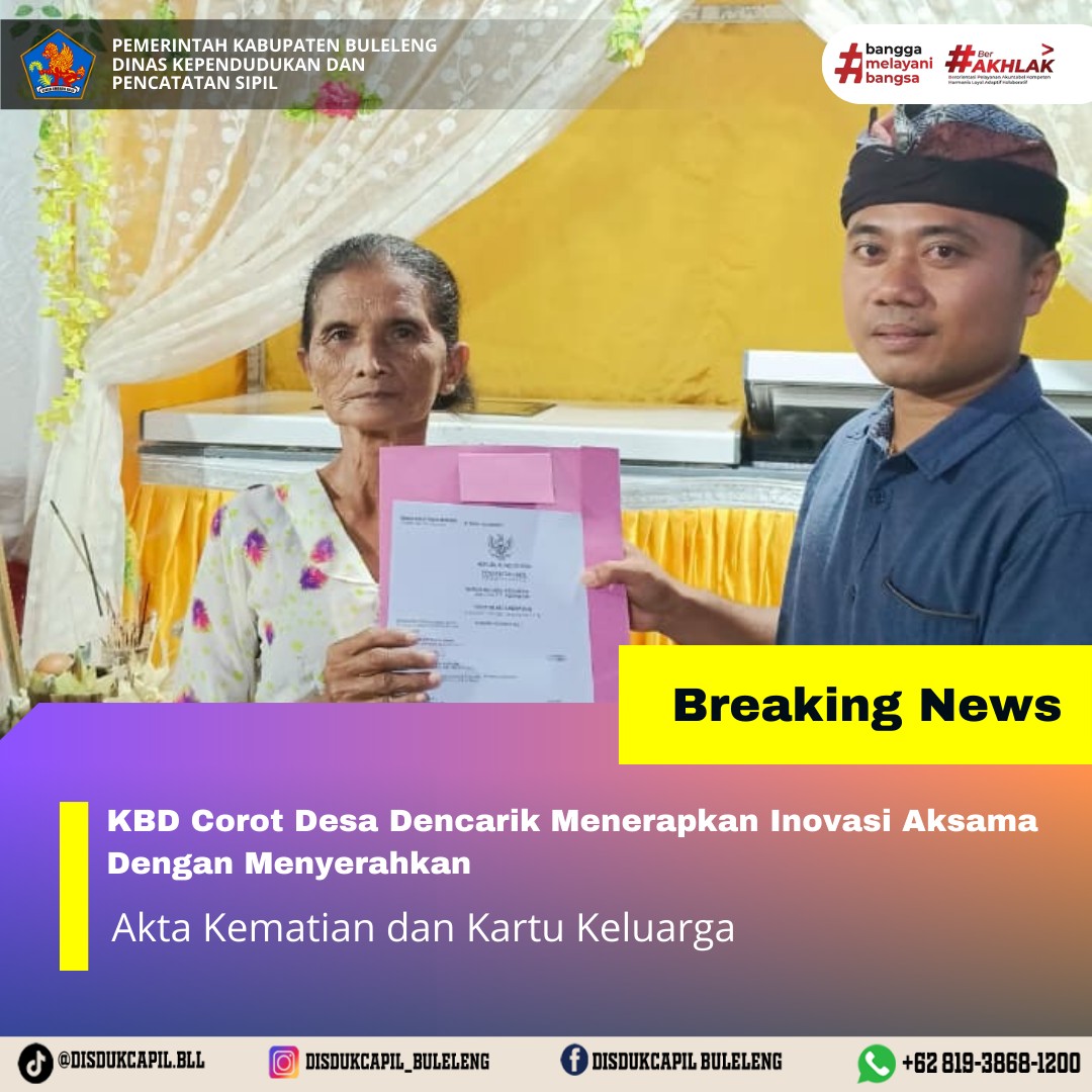 Pemerintah Kabupaten Buleleng melalui Dinas Kependudukan dan Pecatatan Sipil (Disdukcapil) Kabupaten Buleleng memaksimalkan serta mempermudah pelayanan kependudukan masyarakat dengan beberapa inovasi, yakni BALITA (Bayi Lahir Berakta), NYAKSI (Menyerahkan Akta Kawin Saat Acara Perkawinan) dan AKSAMA ( Akta Kematian Diserahkan Saat Masih Berduka) melalui aplikasi Aku Online-NG. Di Desa Dencarik Kecamatan Banjar, telah diterapkan program Aksama (Akta Kematian Diserahkan Saat Masih Berduka) yang dilakukan secara langsung oleh Kelian Banjar Dinas Corot Desa Dencarik dengan menyerahkan Akta Kematian atas nama Nyoman Kastara dan Kartu Keluarga kepada keluarga almarhum di Rumah Duka di Desa Dencarik Kecamatan Banjar, Senin (22/12).