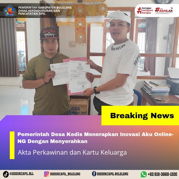 Pemerintah Kabupaten Buleleng melalui Dinas Kependudukan dan Pecatatan Sipil (Disdukcapil) Kabupaten Buleleng memaksimalkan serta mempermudah pelayanan kependudukan masyarakat dengan beberapa inovasi, melalui aplikasi AKU Online-NG. Dimana dalam penerapan aplikasi Aku Online-NG tersebut masyarakat tidak perlu lagi datang ke Dinas Dukcapil untuk melakukan pelayanan langsung cukup dengan datang ke Desa nanti akan dibantu oleh operator Desa masing-masing. Di Desa Kedis Kecamatan Busungbiu, telah diserahkan dokumen kependudukan berupa Akta Perkawinan dan Kartu keluarga karena perubahan data kepada warga Banjar Dinas Kangin Desa Kedis, Kecamatan Busungbiu, yang diserahkan langsung oleh Kasi Pemerintahan Desa Kedis, Rabu (24/12).