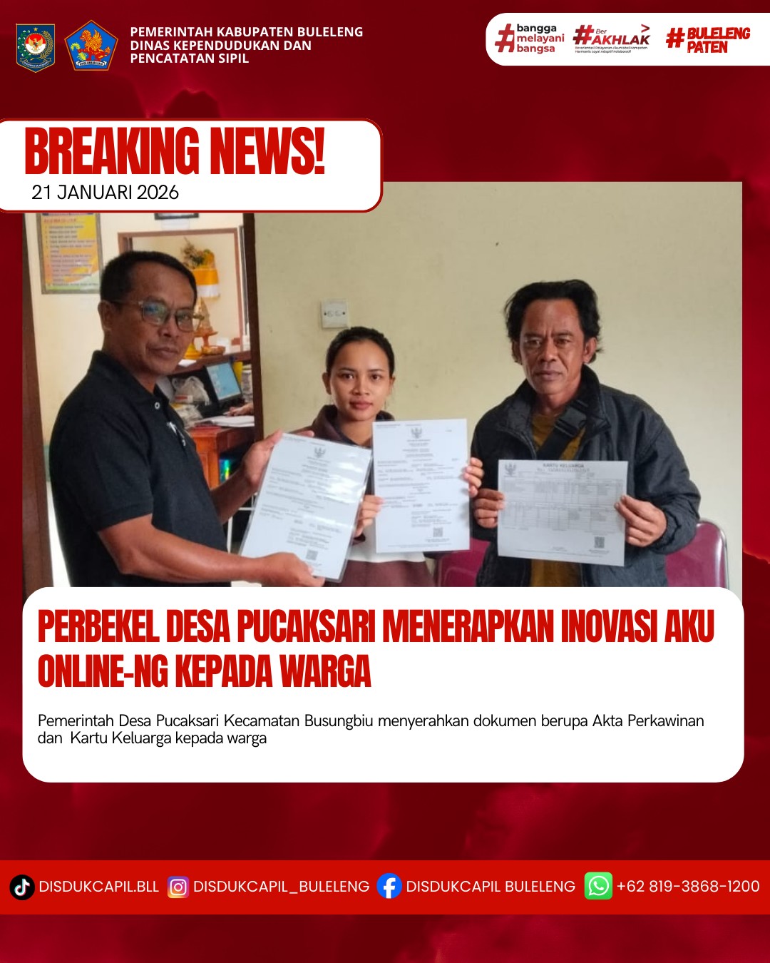 Pemerintah Kabupaten Buleleng melalui Dinas Kependudukan dan Pecatatan Sipil (Disdukcapil) Kabupaten Buleleng memaksimalkan serta mempermudah pelayanan kependudukan masyarakat dengan beberapa inovasi, melalui aplikasi AKU Online-NG. Dimana dalam penerapan aplikasi Aku Online-NG tersebut masyarakat tidak perlu lagi datang ke Dinas Dukcapil untuk melakukan pelayanan langsung cukup dengan datang ke Desa nanti akan dibantu oleh operator Desa masing-masing. Di Desa Pucaksari Kecamatan Busungbiu, telah diserahkan dokumen kependudukan berupa Akta Perkawinan dan Kartu Keluarga atas nama Wayan Sudiarta yang diserahkan langsung oleh Perbekel Desa Pucaksari I Ketut Maliani, Rabu (21/1).