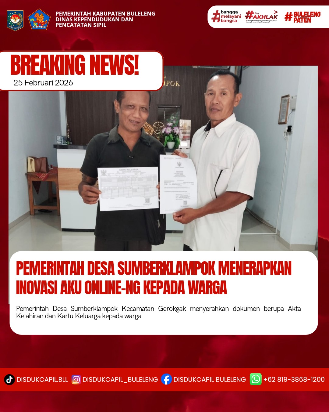 Pemerintah Kabupaten Buleleng melalui Dinas Kependudukan dan Pecatatan Sipil (Disdukcapil) Kabupaten Buleleng memaksimalkan serta mempermudah pelayanan kependudukan masyarakat dengan beberapa inovasi, melalui aplikasi AKU Online-NG. Dimana dalam penerapan aplikasi Aku Online-NG tersebut masyarakat tidak perlu lagi datang ke Dinas Dukcapil untuk melakukan pelayanan langsung cukup dengan datang ke Desa nanti akan dibantu oleh operator Desa masing-masing. Di Desa Sumberklampok Kecamatan Gerokgak, telah diserahkan dokumen kependudukan berupa Akta Kelahiran dan Kartu Keluarga atas nama I PUTU WIDIANA yang diserahkan secara langsung oleh Kasi Pelayanan Desa Sumberklampok bertempat di Kantor Perbekel Desa Sumberklampok, Kecamatan Gerokgak, Rabu (25/2).