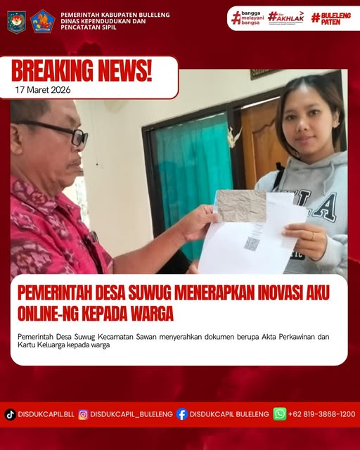 Pemerintah Kabupaten Buleleng melalui Dinas Kependudukan dan Pecatatan Sipil (Disdukcapil) Kabupaten Buleleng memaksimalkan serta mempermudah pelayanan kependudukan masyarakat dengan beberapa inovasi, melalui aplikasi AKU Online-NG. Dimana dalam penerapan aplikasi Aku Online-NG tersebut masyarakat tidak perlu lagi datang ke Dinas Dukcapil untuk melakukan pelayanan langsung, cukup dengan datang ke Desa nanti akan dibantu oleh operator Desa masing-masing. Di Desa Suwug Kecamatan Sawan, telah diserahkan dokumen kependudukan berupa Tridatu Akta Perkawinan yang diserahkan secara lansung oleh Kasi Pemerintahan Desa Suwug, Selasa (17/3).