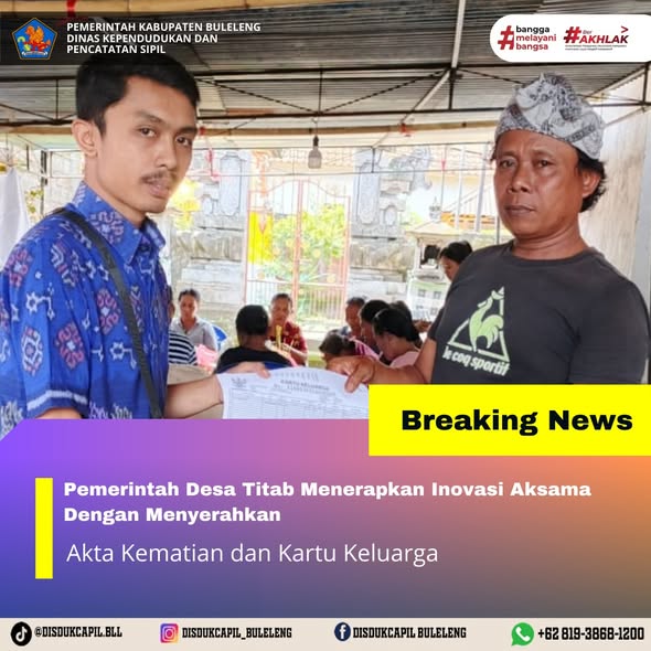 Pemerintah Kabupaten Buleleng melalui Dinas Kependudukan dan Pecatatan Sipil (Disdukcapil) Kabupaten Buleleng memaksimalkan serta mempermudah pelayanan kependudukan masyarakat dengan beberapa inovasi, yakni BALITA (Bayi Lahir Berakta), NYAKSI (Menyerahkan Akta Kawin Saat Acara Perkawinan) dan AKSAMA ( Akta Kematian Diserahkan Saat Masih Berduka) melalui aplikasi Aku Online-NG. Di Desa Titab Kecamatan Busungbiu, telah diterapkan program Aksama (Akta Kematian Diserahkan Saat Masih Berduka) yang dilakukan secara langsung oleh Pemerintah Desa Titab Kecamatan Busungbiu dengan menyerahkan Akta Kematian atas nama I NYOMAN DHANA dan Kartu Keluarga atas nama NI PUTU SUWARSIH kepada pihak keluarga almarhum dari Banjar Dinas Baledana Desa Titab Kecamatan Busungbiu, Selasa (25/11).