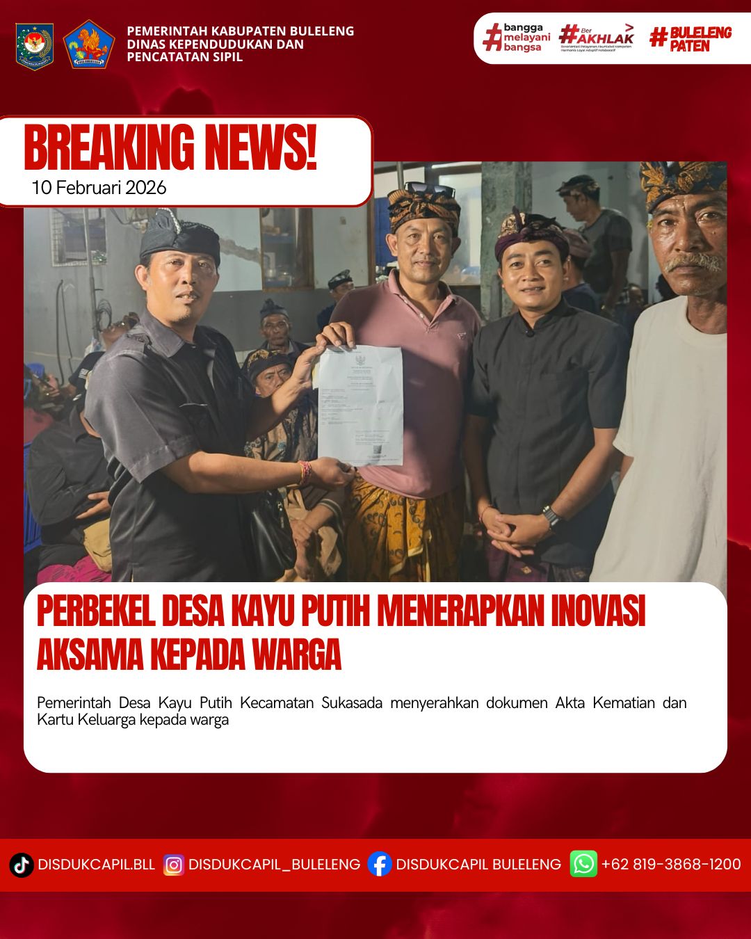 Pemerintah Kabupaten Buleleng melalui Dinas Kependudukan dan Pecatatan Sipil (Disdukcapil) Kabupaten Buleleng memaksimalkan serta mempermudah pelayanan kependudukan masyarakat dengan beberapa inovasi, yakni BALITA (Bayi Lahir Berakta), NYAKSI (Menyerahkan Akta Kawin Saat Acara Perkawinan) dan AKSAMA ( Akta Kematian Diserahkan Saat Masih Berduka) melalui aplikasi Aku Online. Di Desa Kayu Putih Kecamatan Sukasada, telah diterapkan program Aksama (Akta Kematian Diserahkan Saat Masih Berduka) yang dilakukan secara langsung oleh Perbekel Desa Kayu Putih Gede Gelgel Ariawan didampingi Kelian Banjar Dinas Panti dengan menyerahkan Akta Kematian atas nama Made Rasmi dan Kartu Keluarga kepada keluarga almarhum di Desa Kayu Putih Kecamatan Sukasada, Selasa (10/2).
