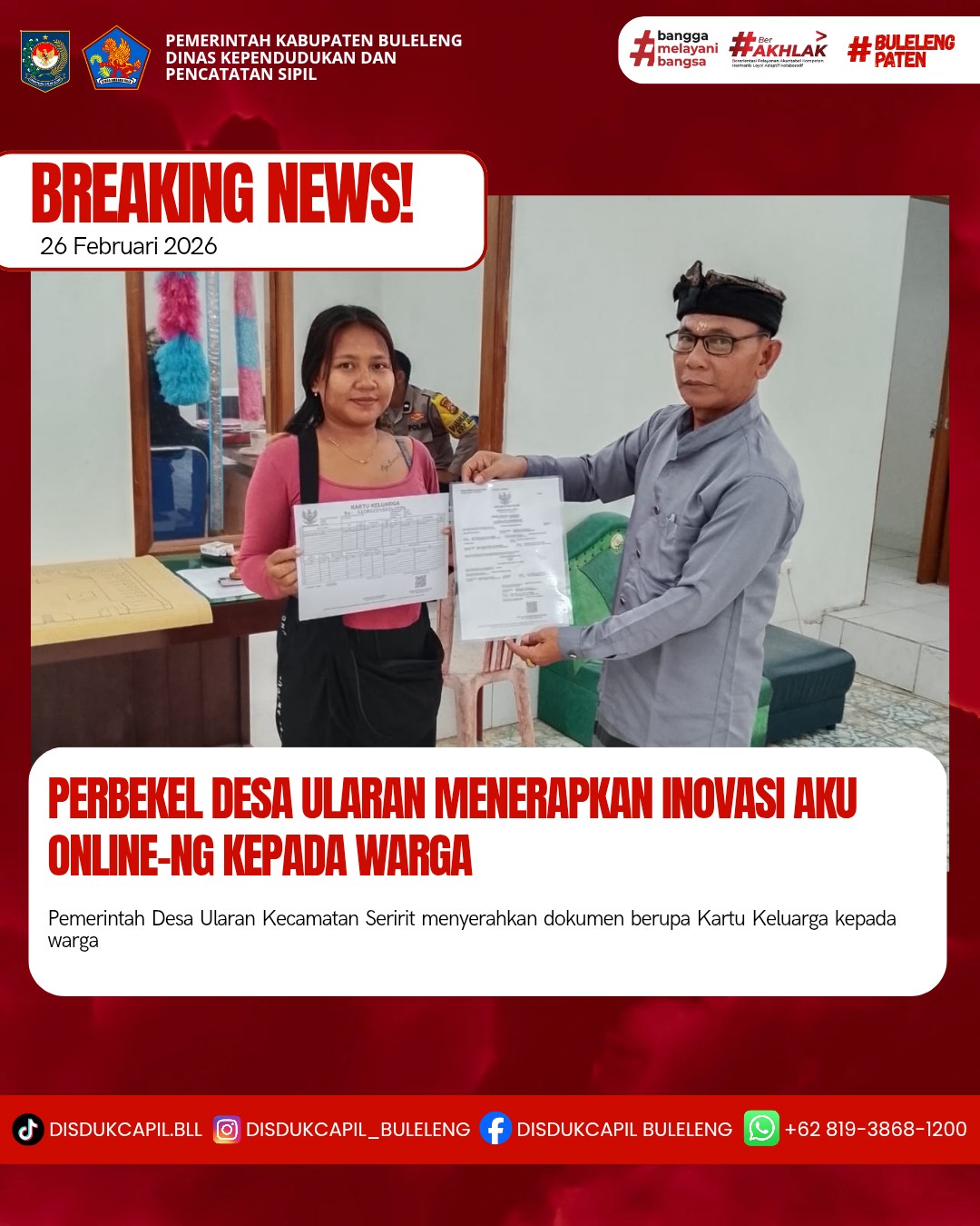 Pemerintah Kabupaten Buleleng melalui Dinas Kependudukan dan Pecatatan Sipil (Disdukcapil) Kabupaten Buleleng memaksimalkan serta mempermudah pelayanan kependudukan masyarakat dengan beberapa inovasi, melalui aplikasi AKU Online-NG. Dimana dalam penerapan aplikasi Aku Online-NG tersebut masyarakat tidak perlu lagi datang ke Dinas Dukcapil untuk melakukan pelayanan langsung cukup dengan datang ke Desa nanti akan dibantu oleh operator Desa masing-masing. Di Desa Ularan Kecamatan Seririt, telah diserahkan dokumen kependudukan berupa Kartu Keluarga atas nama Ni Kadek Poni Sintya Dewi warga Desa Ularan yang diserahkan langsung oleh Perbekel Desa Ularan I GUSTI NYOMAN SURYAWAN bertempat di kantor Perbekel Desa Ularan, Kecamatan Seririt, Kabupaten Buleleng, Kamis (26/2).