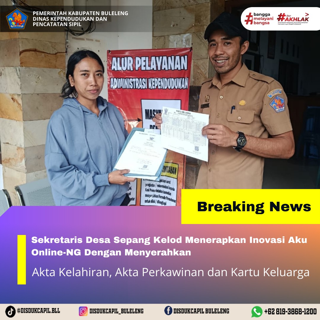 Pemerintah Kabupaten Buleleng melalui Dinas Kependudukan dan Pecatatan Sipil (Disdukcapil) Kabupaten Buleleng memaksimalkan serta mempermudah pelayanan kependudukan masyarakat dengan beberapa inovasi, melalui aplikasi AKU Online-NG. Dimana dalam penerapan aplikasi Aku Online-NG tersebut masyarakat tidak perlu lagi datang ke Dinas Dukcapil untuk melakukan pelayanan langsung cukup dengan datang ke Desa nanti akan dibantu oleh operator Desa masing-masing. Di Desa Sepang Kelod Kecamatan Busungbiu, telah diserahkan dokumen kependudukan berupa Akta Perkawinan, Akta Kelahiran dan Kartu Keluarga diserahkan oleh Sekretaris Desa Sepang Kelod bertempat di Kantor Perbekel Desa Sepang Kelod, Kecamatan Busungbiu, Kabupaten Buleleng, Senin (22/12).