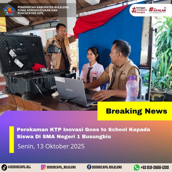 Pada kali ini Senin, 13 Oktober 2025 pelayanan perekaman KTP-el dilaksanakan di SMA Negeri 1 Busungbiu. Hasil perekaman di SMA Negeri 1 Busungbiu dengan data BNBA sebanyak 39 orang dan total yang melakukan perekaman sebanyak 67 orang, dimana hasil perekaman data di dalam BNBA yang melakukan perekaman sebanyak 6 orang dan data di luar BNBA sebanyak 61 orang yang melakukan perekaman. Sisa data dalam BNBA yang belum melakukan perekaman sebanyak 33 orang, keterangan dari pihak sekolah sisa BNBA tidak hadir dan dicari ke kelas masing- masing oleh gurunya tetapi tidak datang untuk melaksanakan petekaman