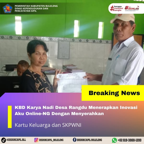 Pemerintah Kabupaten Buleleng melalui Dinas Kependudukan dan Pecatatan Sipil (Disdukcapil) Kabupaten Buleleng memaksimalkan serta mempermudah pelayanan kependudukan masyarakat dengan beberapa inovasi, melalui aplikasi AKU Online-NG. Dimana dalam penerapan aplikasi Aku Online-NG tersebut masyarakat tidak perlu lagi datang ke Dinas Dukcapil untuk melakukan pelayanan langsung cukup dengan datang ke Desa nanti akan dibantu oleh operator Desa masing-masing. Di Banjar Dinas Karya Nadi Desa Rangdu Kecamatan Seririt telah diserahkan dokumen kependudukan berupa Surat Pindah Domisili atas nama Kadek Leny Kusuma Dewi dan Kartu Keluarga oleh Kelian Banjar Dinas Karya Nadi Desa Rangdu Kecamatan Seririt, Rabu (19/2).