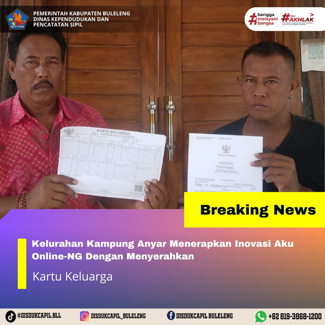 Pemerintah Kabupaten Buleleng melalui Dinas Kependudukan dan Pecatatan Sipil (Disdukcapil) Kabupaten Buleleng memaksimalkan serta mempermudah pelayanan kependudukan masyarakat dengan beberapa inovasi, melalui aplikasi AKU Online-NG. Dimana dalam penerapan aplikasi Aku Online-NG tersebut masyarakat tidak perlu lagi datang ke Dinas Dukcapil untuk melakukan pelayanan langsung cukup dengan datang ke Desa nanti akan dibantu oleh operator Desa masing-masing. Di Kelurahan Kampung Anyar Kecamatan Buleleng, telah diserahkan dokumen kependudukan berupa Kartu Keluarga atas nama Nengah Rai yang diserahkan langsung oleh Kelurahan Kampung Anyar Kecamatan Buleleng, Kabupaten Buleleng, Selasa (30/12).