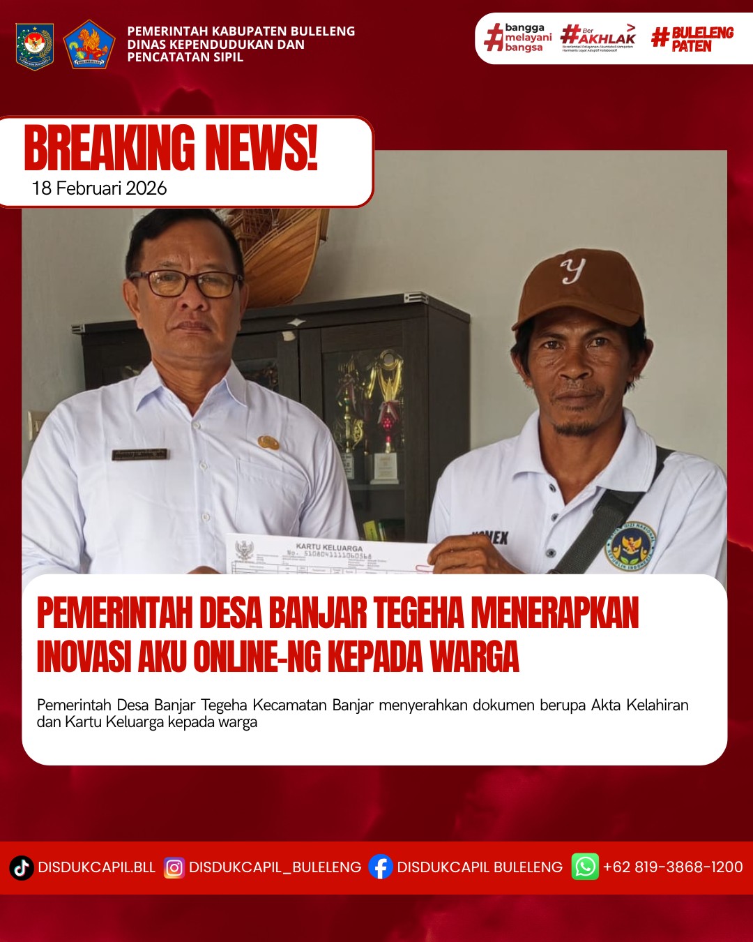 Pemerintah Kabupaten Buleleng melalui Dinas Kependudukan dan Pecatatan Sipil (Disdukcapil) Kabupaten Buleleng memaksimalkan serta mempermudah pelayanan kependudukan masyarakat dengan beberapa inovasi, melalui aplikasi AKU Online-NG. Dimana dalam penerapan aplikasi Aku Online-NG tersebut masyarakat tidak perlu lagi datang ke Dinas Dukcapil untuk melakukan pelayanan langsung cukup dengan datang ke Desa nanti akan dibantu oleh operator Desa masing-masing. Di Desa Banjar Tegeha Kecamatan Banjar, telah diserahkan dokumen kependudukan berupa Akta Kelahiran dan Kartu Keluarga atas nama Putu Darma Semadi yang diserahkan secara langsung oleh Perbekel Desa Banjar Tegeha Ida Bagus Komang Sistiadi, Rabu (18/2).