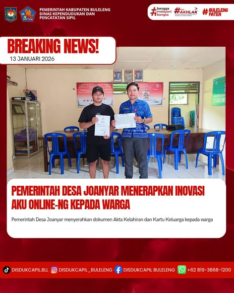 Pemerintah Kabupaten Buleleng melalui Dinas Kependudukan dan Pecatatan Sipil (Disdukcapil) Kabupaten Buleleng memaksimalkan serta mempermudah pelayanan kependudukan masyarakat dengan beberapa inovasi, melalui aplikasi AKU Online-NG. Dimana dalam penerapan aplikasi Aku Online-NG tersebut masyarakat tidak perlu lagi datang ke Dinas Dukcapil untuk melakukan pelayanan langsung cukup dengan datang ke Desa nanti akan dibantu oleh operator Desa masing-masing. Di Desa Joanyar Kecamatan Seririt, telah diserahkan dokumen kependudukan berupa Akta Kelahiran dan Kartu Keluarga atas nama Putu Eka Purnama yang diserahkan secara langsung oleh Kasi Pemerintahan Desa Joanyar Kecamatan Seririt, Selasa (13/1).