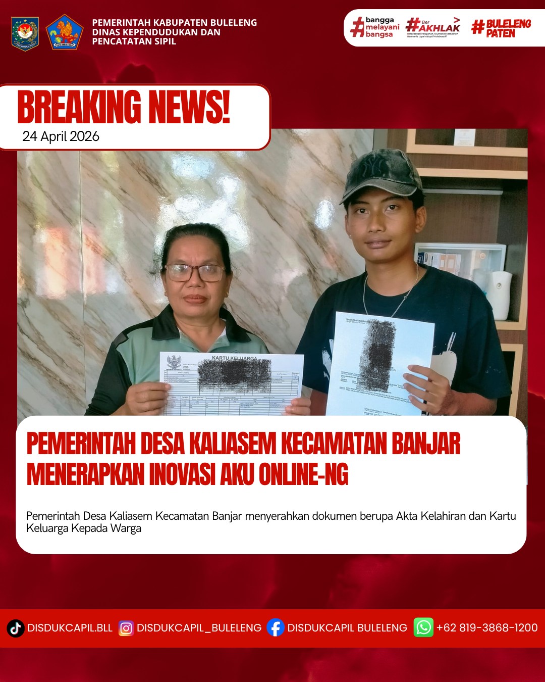 Pemerintah Kabupaten Buleleng melalui Dinas Kependudukan dan Pecatatan Sipil (Disdukcapil) Kabupaten Buleleng memaksimalkan serta mempermudah pelayanan kependudukan masyarakat dengan beberapa inovasi, melalui aplikasi AKU Online. Dimana dalam penerapan aplikasi Aku Online tersebut masyarakat tidak perlu lagi datang ke Dinas Dukcapil untuk melakukan pelayanan langsung, cukup dengan datang ke Desa nanti akan dibantu oleh operator Desa masing-masing. Di Desa Kaliasem Kecamatan Banjar telah diserahkan dokumen kependudukan berupa Akta Kelahiran atas nama Ni Putu Clarissa Aruna Suputri dan Kartu Keluarga an. Putu Suastika yang diserahkan oleh Kasi Pemerintahan Desa Kaliasem Kecamatan Banjar, Jumat (24/4).