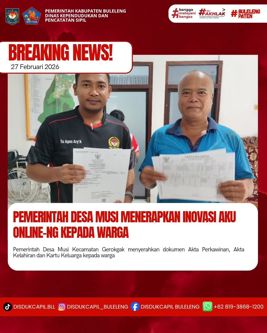 Pemerintah Kabupaten Buleleng melalui Dinas Kependudukan dan Pecatatan Sipil (Disdukcapil) Kabupaten Buleleng memaksimalkan serta mempermudah pelayanan kependudukan masyarakat dengan beberapa inovasi, melalui aplikasi AKU Online-NG. Dimana dalam penerapan aplikasi Aku Online-NG tersebut masyarakat tidak perlu lagi datang ke Dinas Dukcapil untuk melakukan pelayanan langsung cukup dengan datang ke Desa nanti akan dibantu oleh operator Desa masing-masing. Di Desa Musi Kecamatan Gerokgak, telah diserahkan dokumen kependudukan berupa Akta Perkawinan, Akta Kelahiran dan Kartu Keluarga yang diserahkan langsung oleh Kasi Pemerintahan Desa Musi Kecamatan Gerokgak, Kabupaten Buleleng, Jumat (27/2).