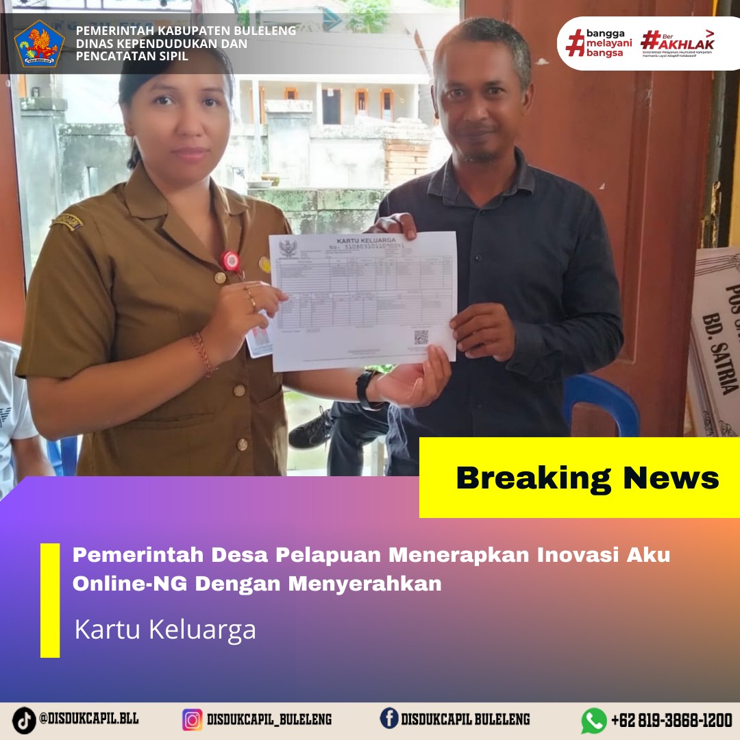 Pemerintah Kabupaten Buleleng melalui Dinas Kependudukan dan Pecatatan Sipil (Disdukcapil) Kabupaten Buleleng memaksimalkan serta mempermudah pelayanan kependudukan masyarakat dengan beberapa inovasi, melalui aplikasi AKU Online-NG. Dimana dalam penerapan aplikasi Aku Online-NG tersebut masyarakat tidak perlu lagi datang ke Dinas Dukcapil untuk melakukan pelayanan langsung cukup dengan datang ke Desa nanti akan dibantu oleh operator Desa masing-masing. Di Desa Pelapuan Kecamatan Busungbiu, telah diserahkan dokumen kependudukan berupa Kartu Keluarga karena perubahan data an. Dewa Made Dwi Adnyana Putra yang diserahkan oleh Kasi Pemerintahan Desa Pelapuan kepada warga Banjar Dinas Bonagung bertempat di Kantor Perbekel Desa Pelapuan, Kecamatan Busungbiu, Kabupaten Buleleng, Senin (29/12).