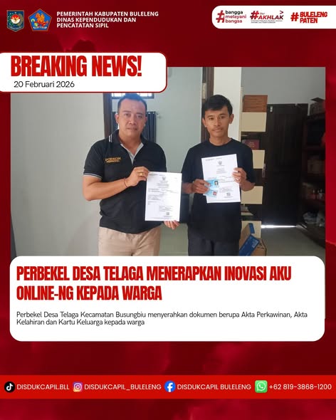 Pemerintah Kabupaten Buleleng melalui Dinas Kependudukan dan Pecatatan Sipil (Disdukcapil) Kabupaten Buleleng memaksimalkan serta mempermudah pelayanan kependudukan masyarakat dengan beberapa inovasi, melalui aplikasi AKU Online-NG. Dimana dalam penerapan aplikasi Aku Online-NG tersebut masyarakat tidak perlu lagi datang ke Dinas Dukcapil untuk melakukan pelayanan langsung cukup dengan datang ke Desa nanti akan dibantu oleh operator Desa masing-masing. Di Desa Telaga Kecamatan Busungbiu, telah diserahkan dokumen kependudukan berupa akta perkawinan atas nama I Putu Darma Susila dengan Ni Made Purwita Dewi, Kartu Keluarga atas nama I Putu Darma Susila dan Akta Kelahiran Anaknya atas nama Ni Luh Padma Sundari berserta KTP asli I I Putu Darma Susila dengan Ni Made Purwita Dewi yang diserahkan langsung oleh Perbekel Desa Telaga Bapak Made Hendra Mahayuda,S.Pd, bertempat di kantor Perbekel Desa Telaga yang beralamat di Banjar Dinas Kumuda Loka, Desa Telaga, Kecamatan Busungbiu, Kabupaten Buleleng, Jumat (20/2).