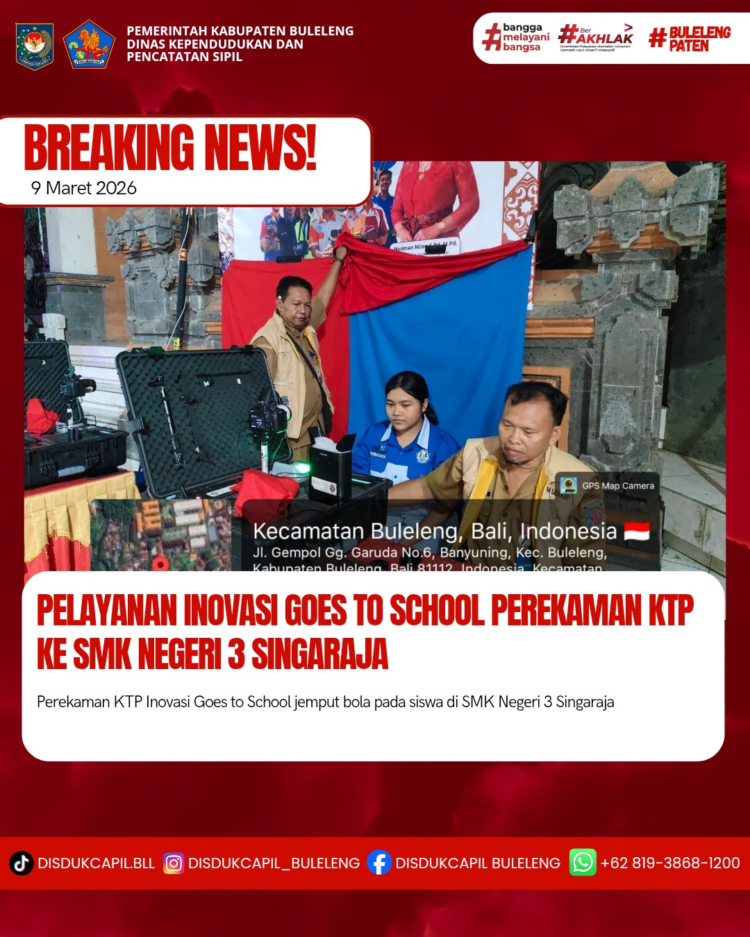 Pada kali ini Senin, 3 Maret 2026 pelayanan perekaman KTP-el dilaksanakan di SMK Negeri 3 Singaraja. Hasil perekaman di SMK Negeri 3 Singaraja dengan data BNBA sebanyak 380 orang dan total yang melakukan perekaman sebanyak 163 orang, dimana hasil perekaman data di dalam BNBA sebanyak 163 orang dan tidak ada data diluar BNBA yang melakukan perekaman. Dilihat dari hasil tersebut sisa data BNBA yang belum perekaman sebanyak 185 orang keterangan dari pihak sekolah untuk sisa BNBA dilanjutkan hari berikutnya.