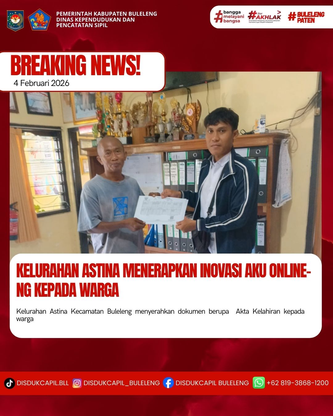 Pemerintah Kabupaten Buleleng melalui Dinas Kependudukan dan Pecatatan Sipil (Disdukcapil) Kabupaten Buleleng memaksimalkan serta mempermudah pelayanan kependudukan masyarakat dengan beberapa inovasi, melalui aplikasi AKU Online-NG. Dimana dalam penerapan aplikasi Aku Online-NG tersebut masyarakat tidak perlu lagi datang ke Dinas Dukcapil untuk melakukan pelayanan langsung cukup dengan datang ke Desa nanti akan dibantu oleh operator Desa masing-masing. Di Kelurahan Astina Kecamatan Buleleng, telah diserahkan dokumen kependudukan berupa Akta Kelahiran yang diserahkan langsung oleh Operator Kelurahan Astina Kecamatan Buleleng, Kabupaten Buleleng, Rabu (4/2).
