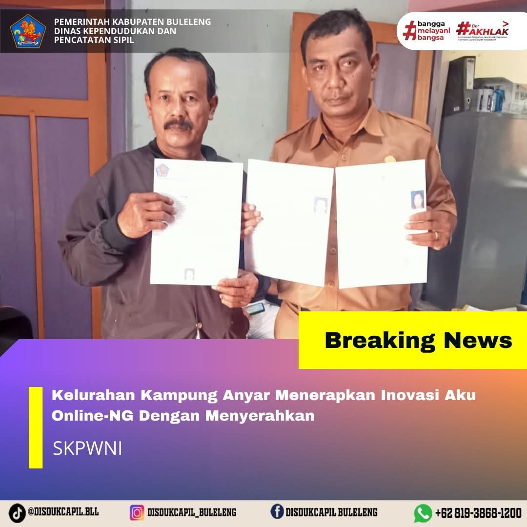 Pemerintah Kabupaten Buleleng melalui Dinas Kependudukan dan Pecatatan Sipil (Disdukcapil) Kabupaten Buleleng memaksimalkan serta mempermudah pelayanan kependudukan masyarakat dengan beberapa inovasi, melalui aplikasi AKU Online-NG. Dimana dalam penerapan aplikasi Aku Online-NG tersebut masyarakat tidak perlu lagi datang ke Dinas Dukcapil untuk melakukan pelayanan langsung cukup dengan datang ke Desa nanti akan dibantu oleh operator Desa masing-masing. Di Kelurahan Kampung Anyar Kecamatan Buleleng, telah diserahkan dokumen kependudukan berupa SKPWNI atas nama Ariyanto yang diserahkan langsung oleh Kelurahan Kampung Anyar Kecamatan Buleleng, Kabupaten Buleleng, Senin (29/12).