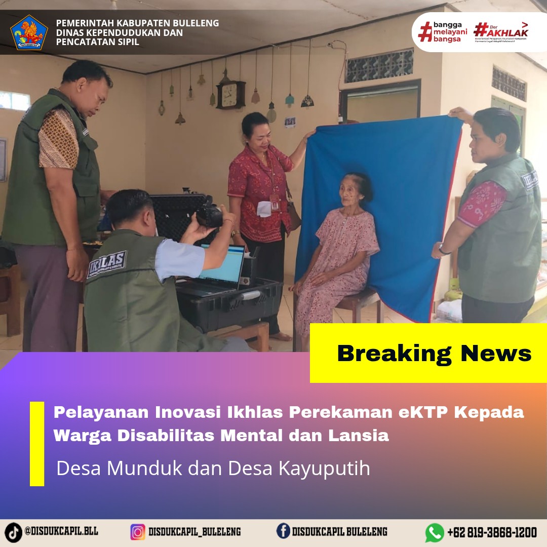 Dinas Kependudukan dan Pencatatan Sipil Kabupaten Buleleng terus berupaya memberikan pelayanan maksimal pada masyarakat dalam rangka meningkatkan kesadaran kepada masyarakat akan pentingnya memiliki dokumen kependudukan salah satunya Kartu Tanda Penduduk (KTP). Berbagai macam inovasi dikembangkan untuk mempermudah masyarakat dapat memiliki dokumen kependudukan. Salah satu Inovasi yang diberikan kepada masyarakat adalah Inovasi "IKHLAS" (Tim Khusus Layanan Untuk Orang Sakit dan Disabilitas) yaitu jembut bola perekaman KTP-el ke rumah warga yang tidak bisa datang langsung ke Kantor Disdukcapil untuk melakukan perekaman eKTP. Sesuai dengan Undang-Undang Republik Indonesia Nomor 24 Tahun 2013 tentang Administrasi Kependudukan, menyatakan bahwa Penduduk Warga Negara Indonesia dan Orang Asing yang memiliki Izin Tinggal Tetap yang telah berumur 17 (tujuh belas) tahun atau telah kawin atau pernah kawin wajib memiliki KTP-el. Namun demikian, ada beberapa penduduk yang tidak bisa datang langsung ke Kantor Dinas Kependudukan dan Pencatatan Sipil Kabupaten Buleleng karena kendala kesehatan dan usia lanjut.